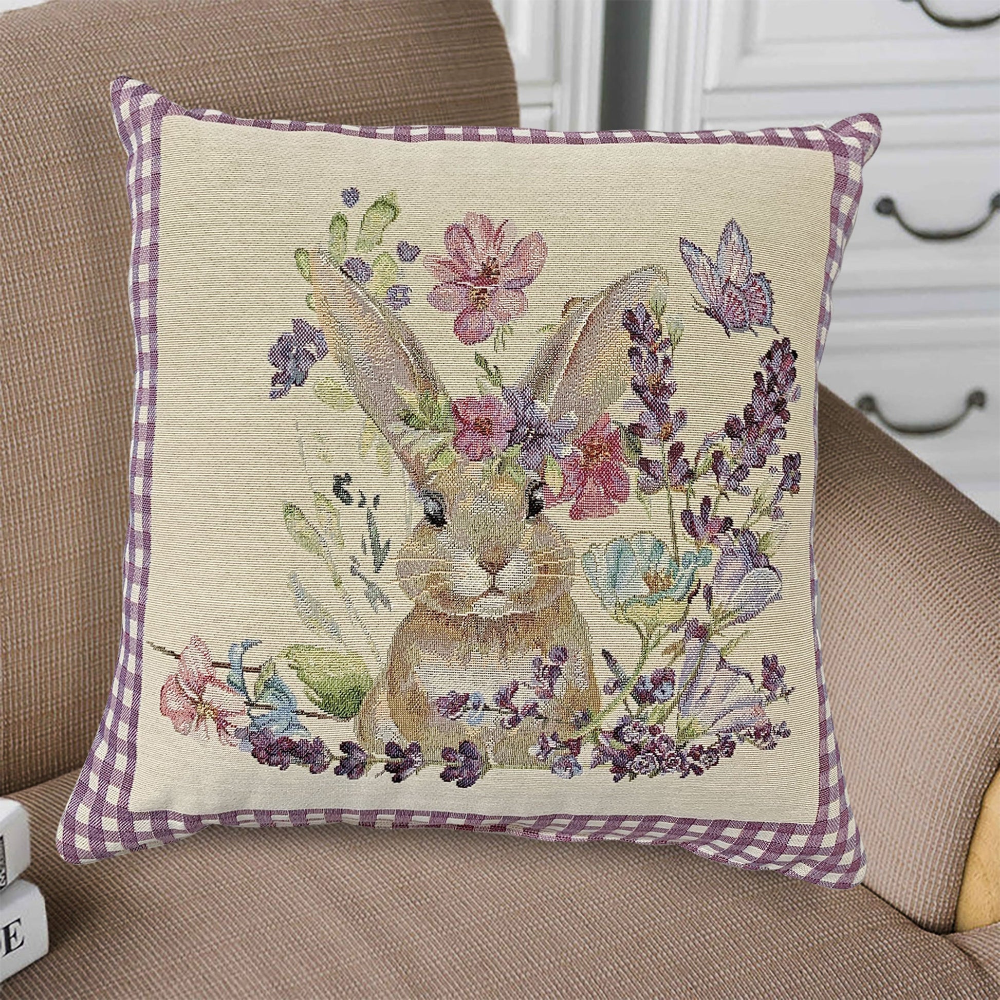 Il cuscino è realizzato in cotone di gobelin di alta qualità ed è perfetto per creare un'atmosfera accogliente e festosa durante le feste di Pasqua grazie alla fantasia presente su entrambi i lati del cuscino con conigli, farfalle, fiori e bordo in vichy.
