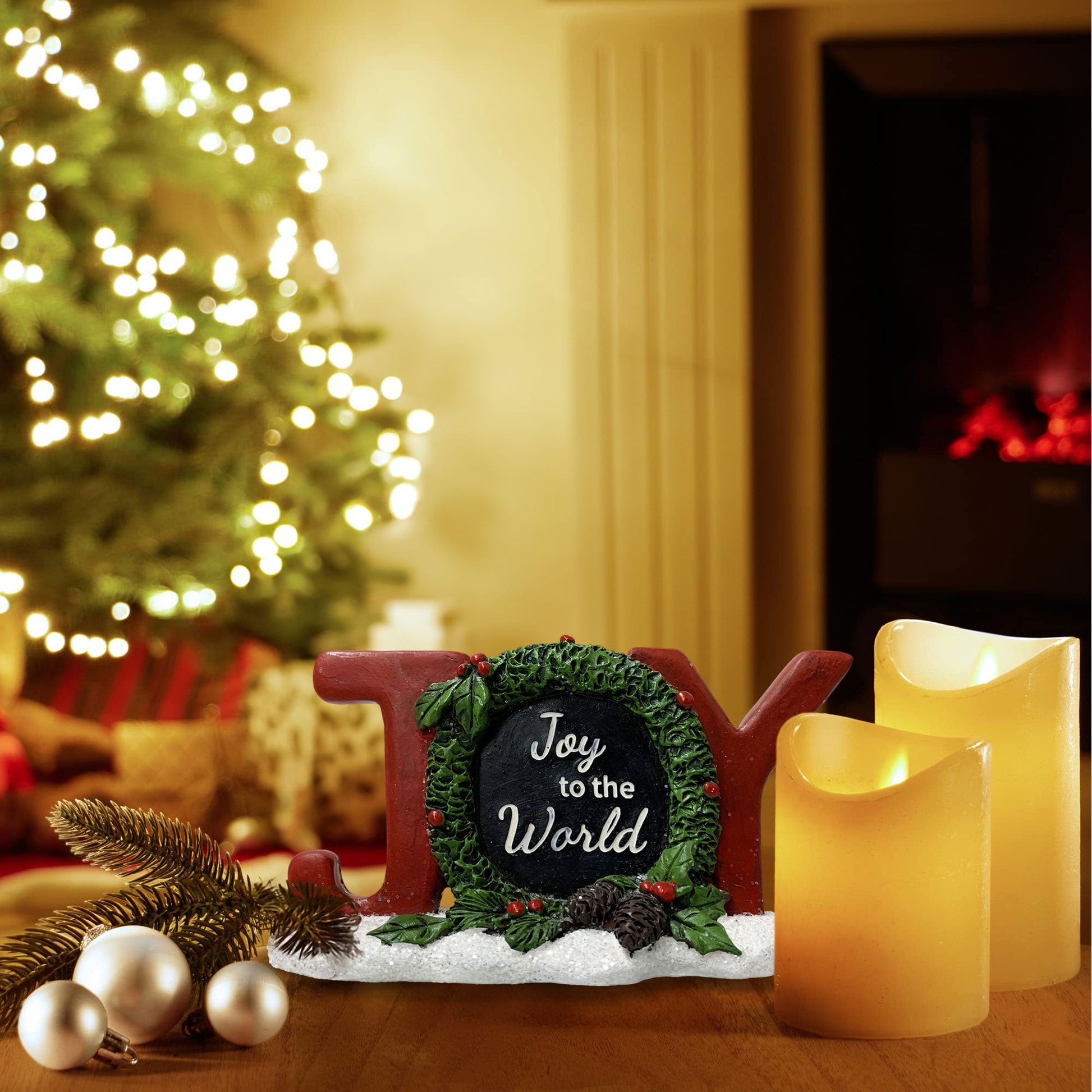 Con dimensioni di 9cm in altezza e 16cm in lunghezza, questa decorazione è un punto focale perfetto per qualsiasi spazio natalizio. La scritta "JOY" in rosso è l'epitome della gioia natalizia, con la lettera "O" che ospita una ghirlanda di agrifoglio e la scritta "Joy to the World." Il tutto è elegantemente posato su una base innevata, catturando l'atmosfera incantata del Natale.