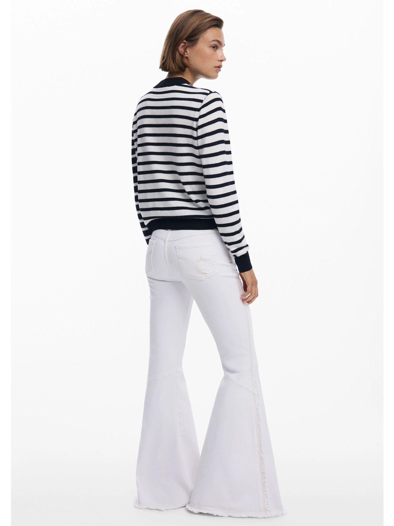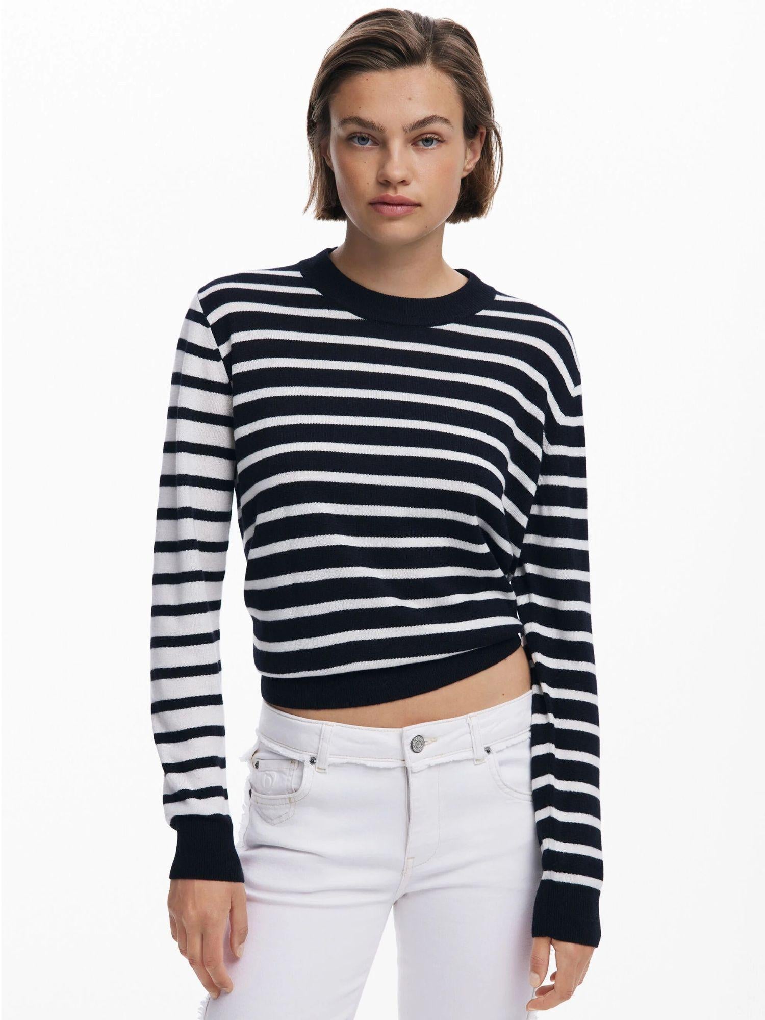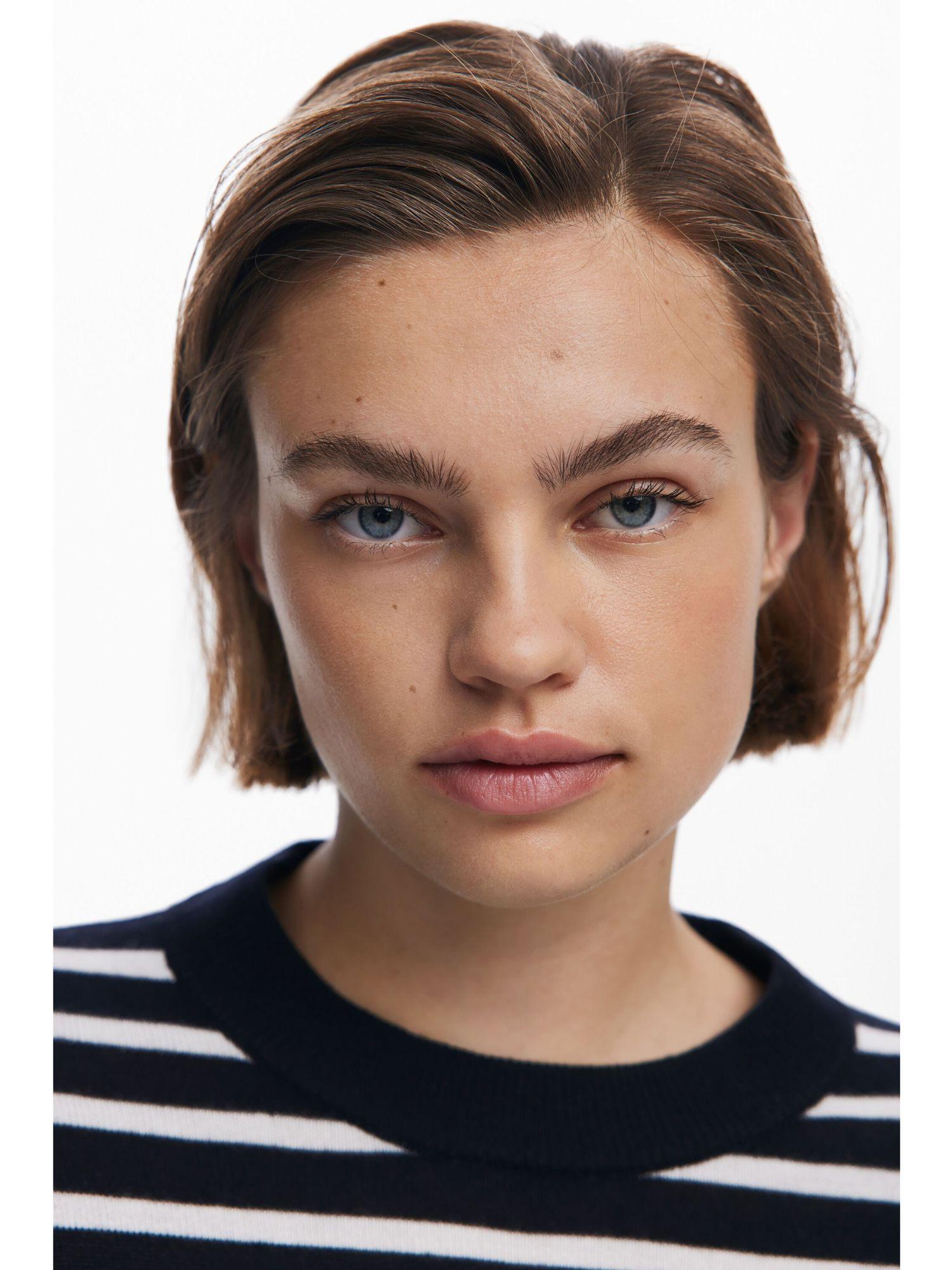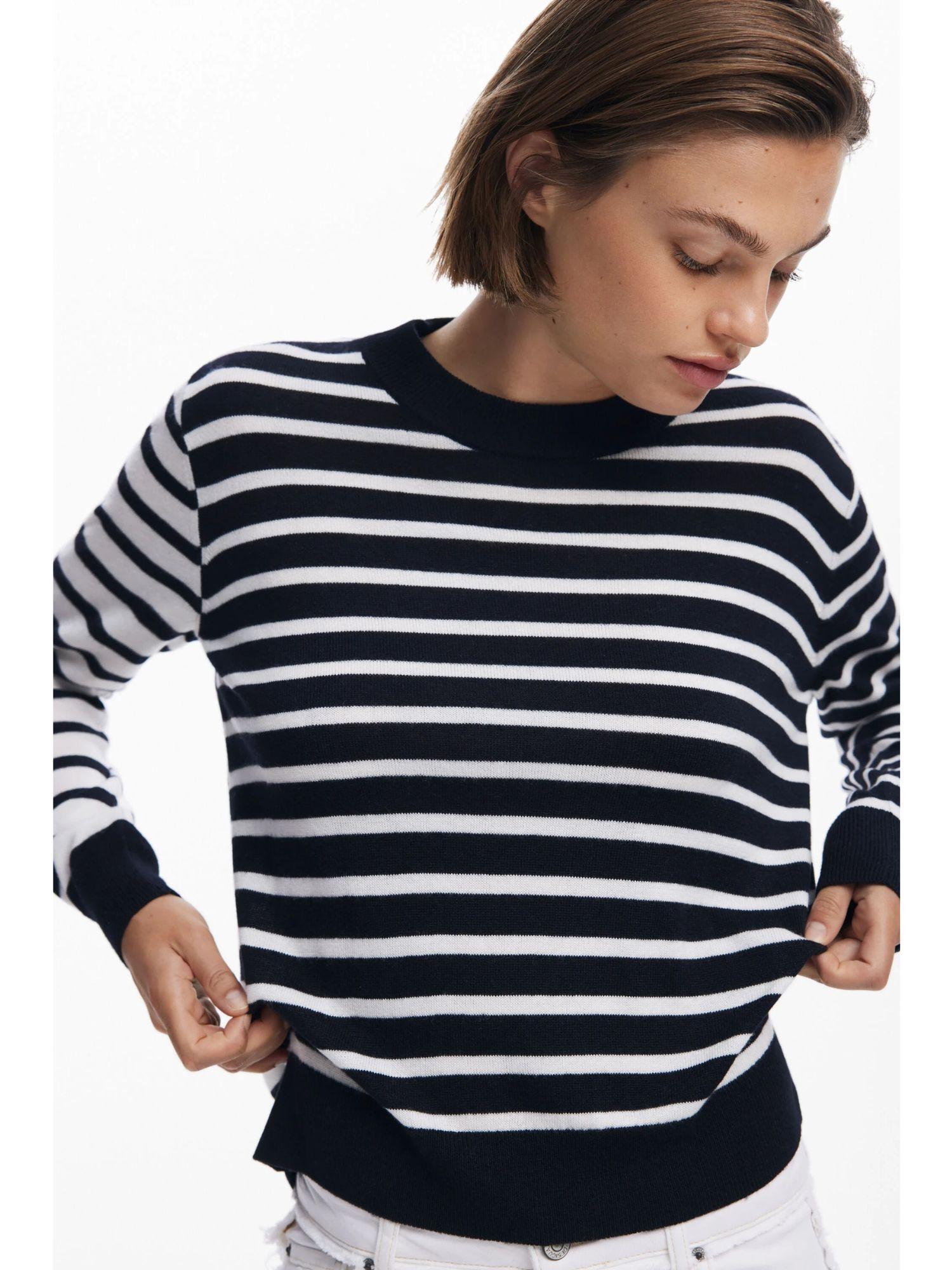 Maglione leggero a maniche lunghe con collo rotondo, stampa a righe orizzontali bicolore e dettaglio di logo ricamato. Stampa a righe. Fit regular. Collo rotondo. Manica lunga. Logo ricamato nella parte inferiore. Stampa bicolore. Collezione AW25. Progettato a Barcellona. Misure modello: altezza 178 cm, vita 60 cm, fianchi 89 cm. Taglia modello: S. Composizione esterna: 45% poliestere, 22% lana, 19% acrilico, 14% poliammide.