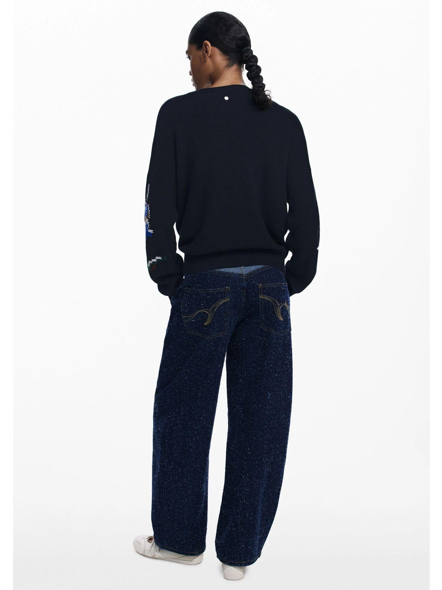 Maglione in tessuto jacquard a maniche lunghe e collo rotondo in colore blu navy con fiori ricamati a punto croce. Colore: tinta unita. Fit regular. Collo rotondo. Manica lunga. Chiusura con bottone. Tessuto jacquard. Fiori ricamati. Collezione AW25. Progettato a Barcellona. Misure modello: altezza 178 cm, vita 59 cm, fianchi 86 cm. Taglia modello: M. Composizione esterna: 100% cotone. Trimming fabric material: 86% acrilico, 14% lana.