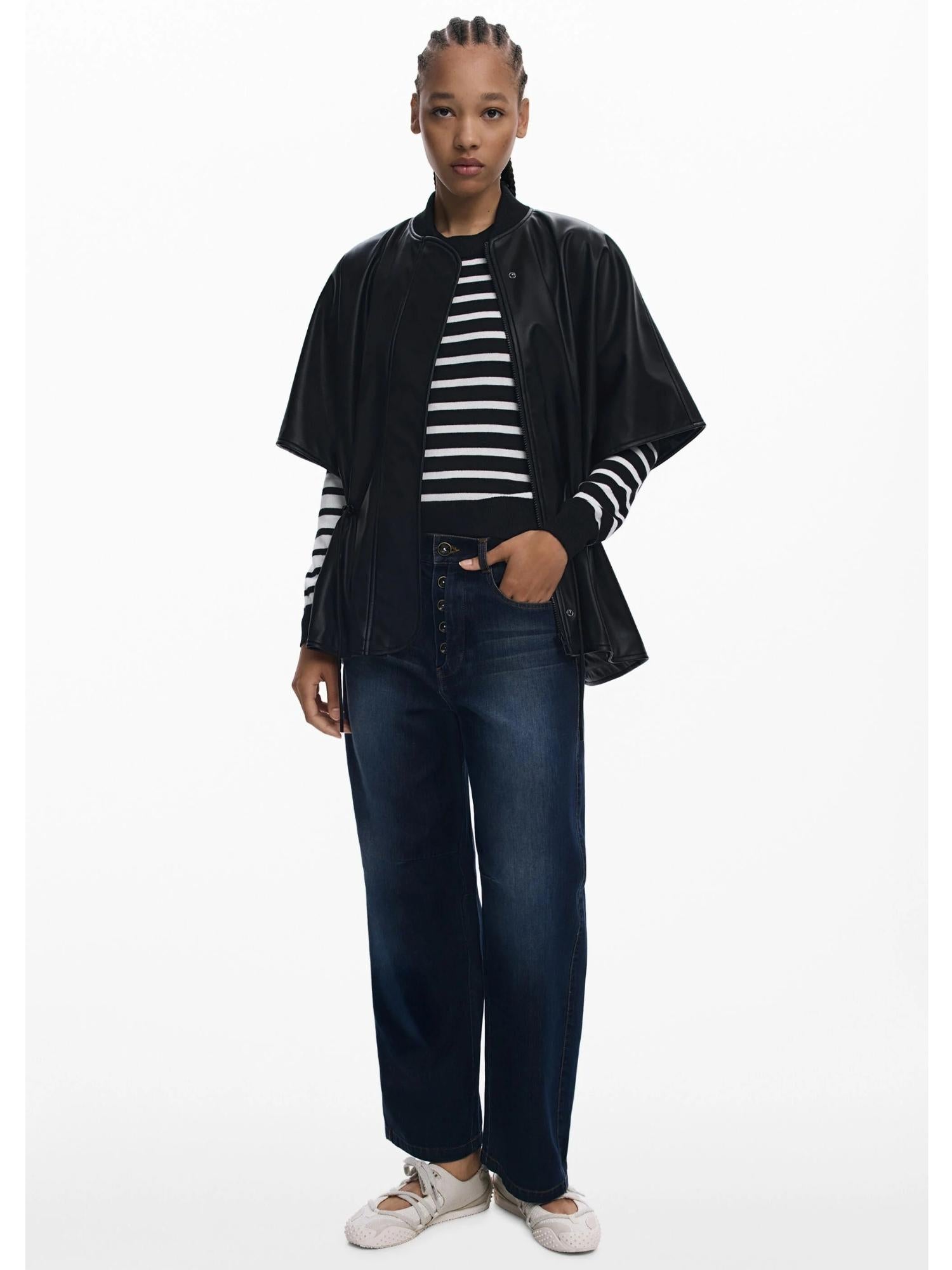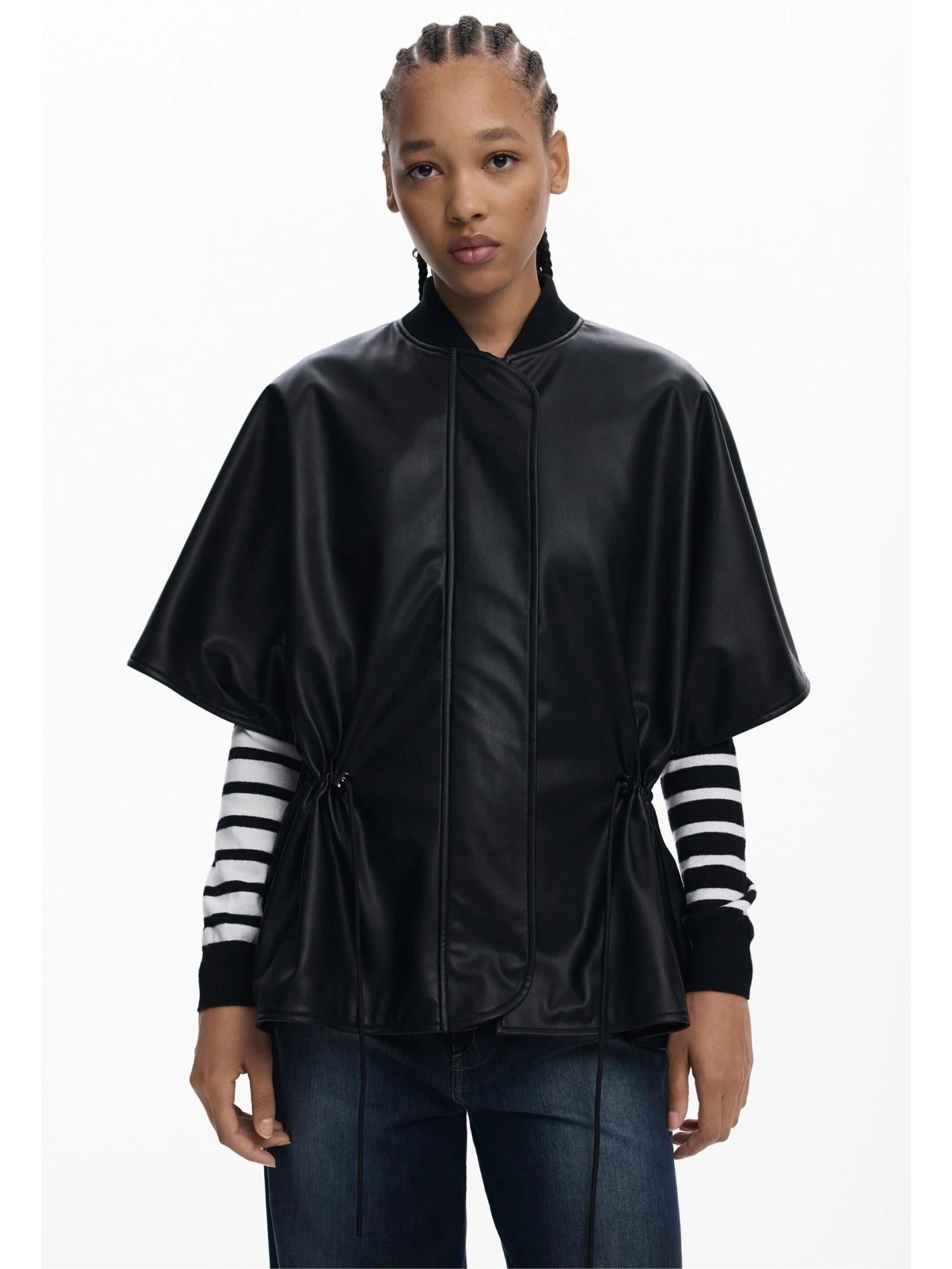Poncho in tessuto effetto pelle con elastico regolabile in vita, chiusura con cerniera e collo rotondo a maglia con rilievi 3D sulla schiena. Effetto pelle. Fit regular. Collo a maglia. Elastico regolabile in vita. Chiusura con cerniera. Dettagli effetto 3D sulla schiena e lavorazioni a maglia. Collezione AW25. Progettato a Barcellona. Taglia unica. Composizione esterna: 100% Poliuretano. Composizione interna: 100% Poliestere.