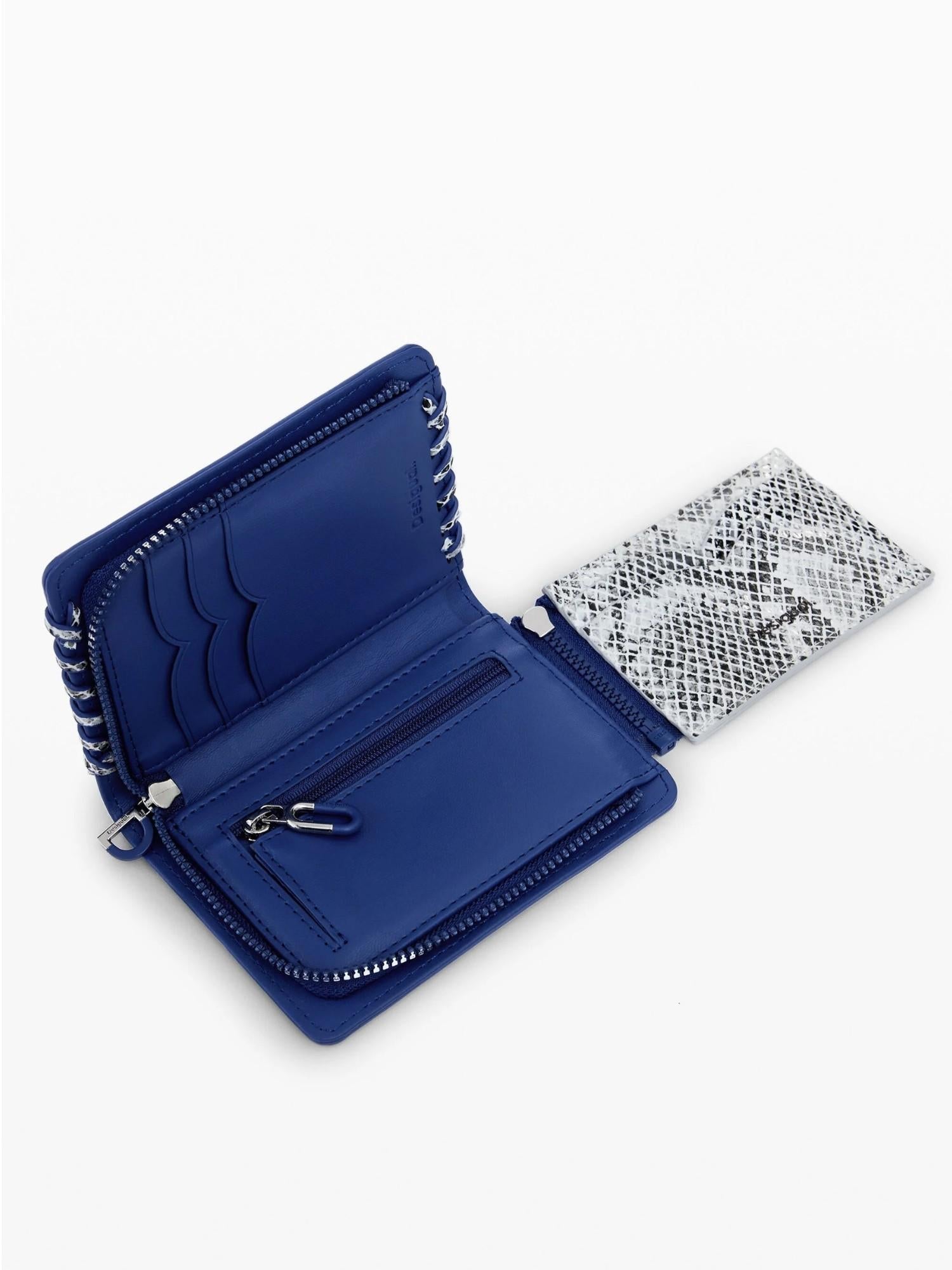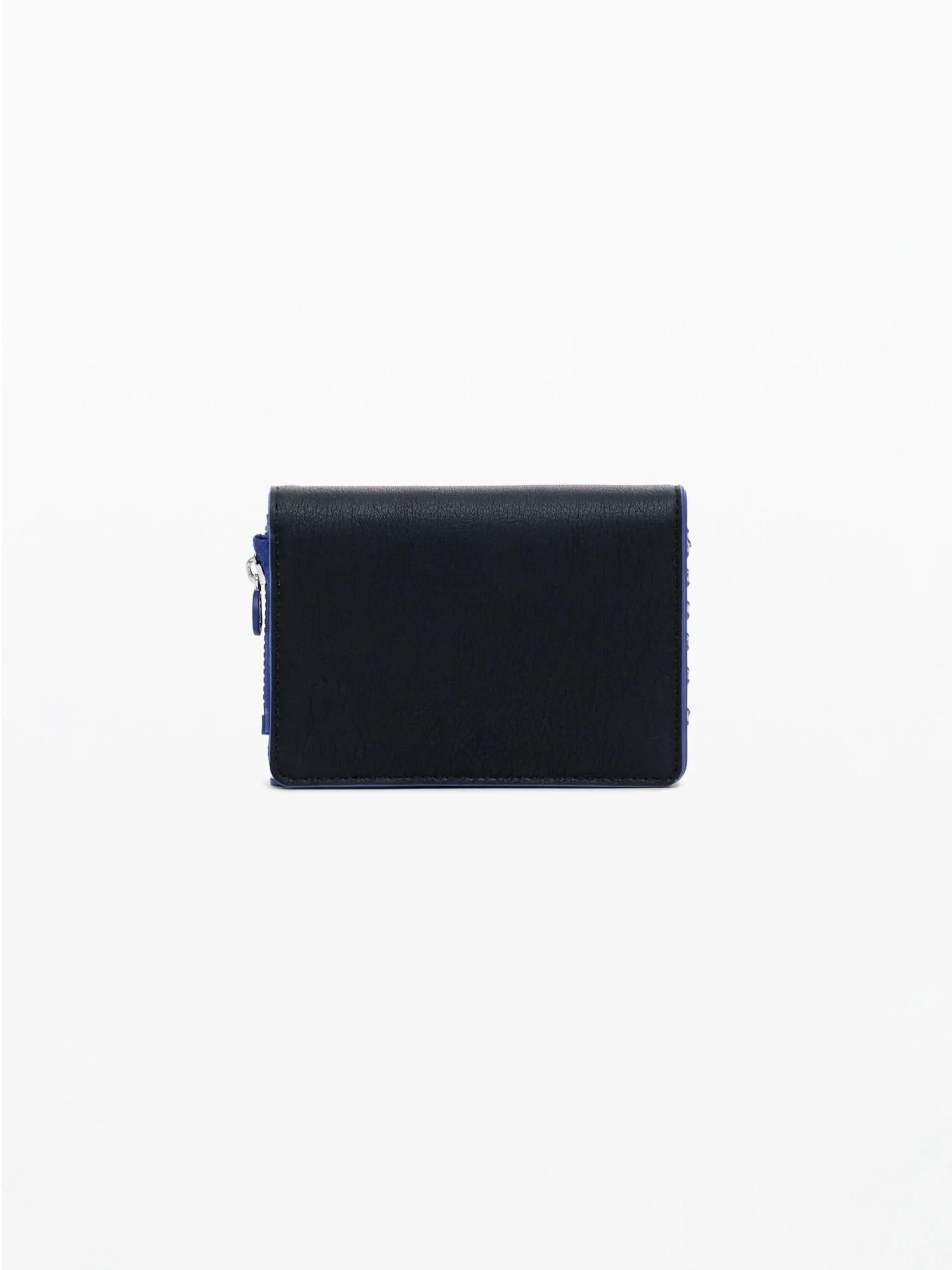Portafoglio medio in effetto pelle con cuciture decorative sui lati, chiusura con bottone, cerniera e logo metallico inciso. Colore: tinta unita con impunture colorate. Chiusura: tipo bottone. Molteplici scomparti interni. Logo in applicazione metallica. Portatessere estraibile. Effetto pelle. Progettato a Barcellona. Misure: 14,2 x 1,5 x 9,5 cm. Composizione esterna: 100% poliuretano. Composizione interna: 100% poliestere.