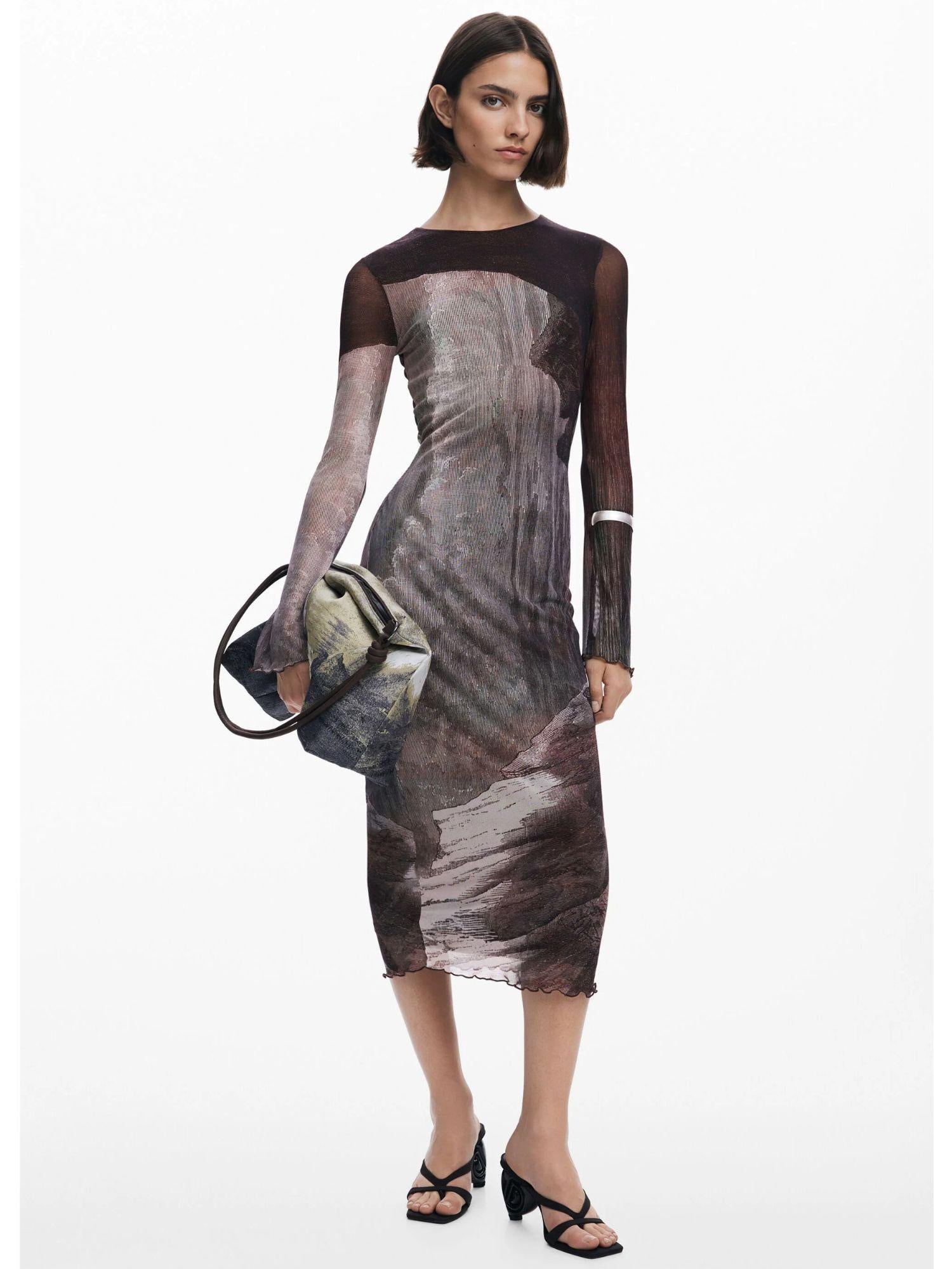 Vestito midi a manica lunga svasata con scollo rotondo, finiture in rib e stampa paesaggistica disegnata da Monsieur Christian Lacroix. Stampa arty. Vestibilità slim. Collo rotondo. Manica lunga. Lunghezza midi. Chiusura con cerniera. Finiture a costine. Realizzato con materiali sostenibili. Collezione AW25. Capsula Exceptionelle disegnata da Mr. Christian Lacroix. Progettato a Barcellona. Poliestere riciclato. Composizione esterna: 96% poliestere, 4% elastan. Composizione interna: 95% viscosa, 5% elastan.