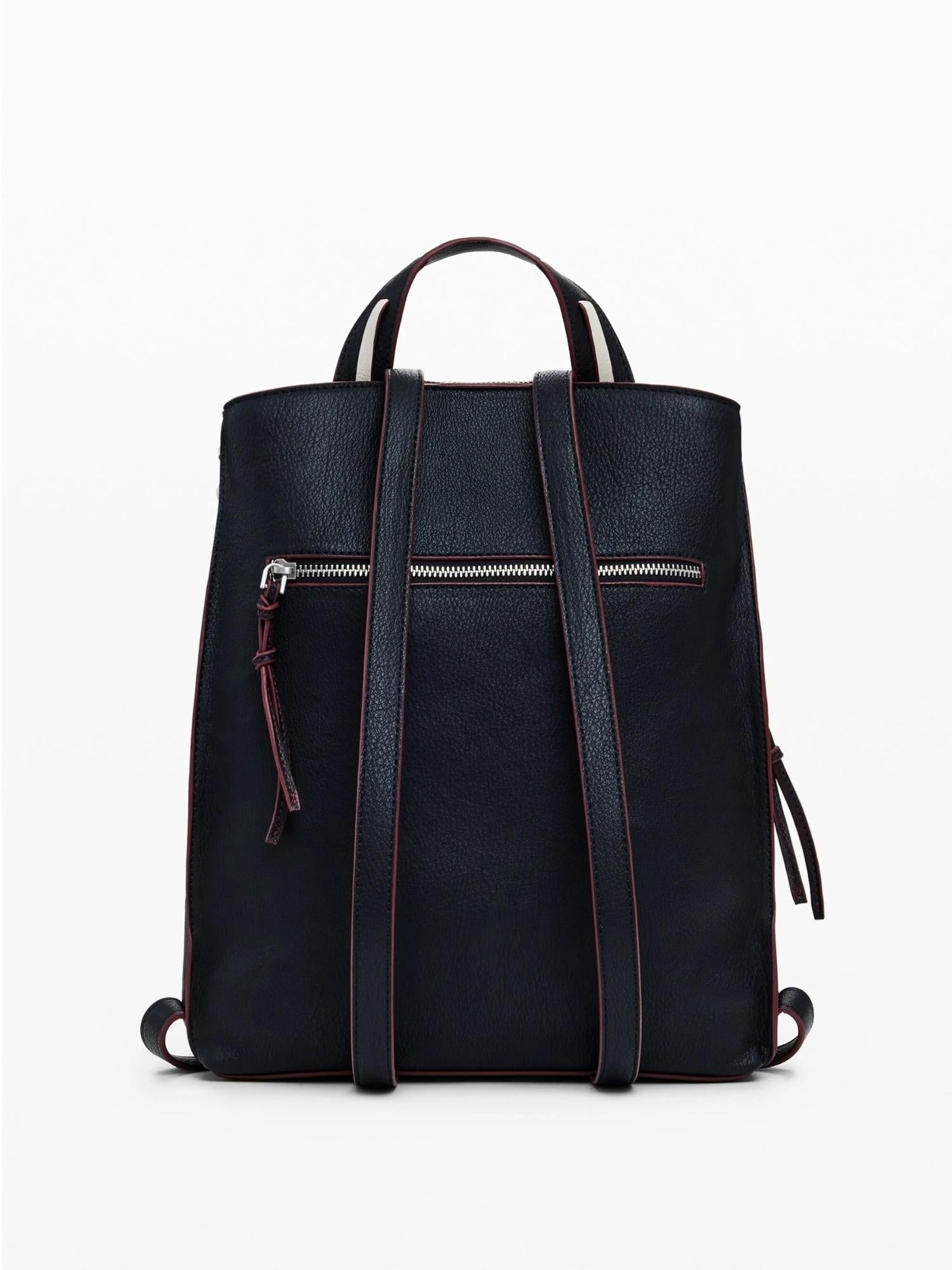 Zaino grande in effetto pelle con impunture a contrasto, vari scomparti e manico tipo borsa rimovibile. Impunture a contrasto. Tasca posteriore esterna. Chiusura con cerniera. Vari scomparti interni. Dettaglio del logo in applicazione metallica. Capacità: 9,4 l. Effetto pelle. Progettato a Barcellona. Misure: 26,70 x 34,50 x 10,20 cm. Composizione esterna: 100% Poliuretano. Composizione interna: 100% Poliestere. Trimming fabric material: 100% Poliuretano.