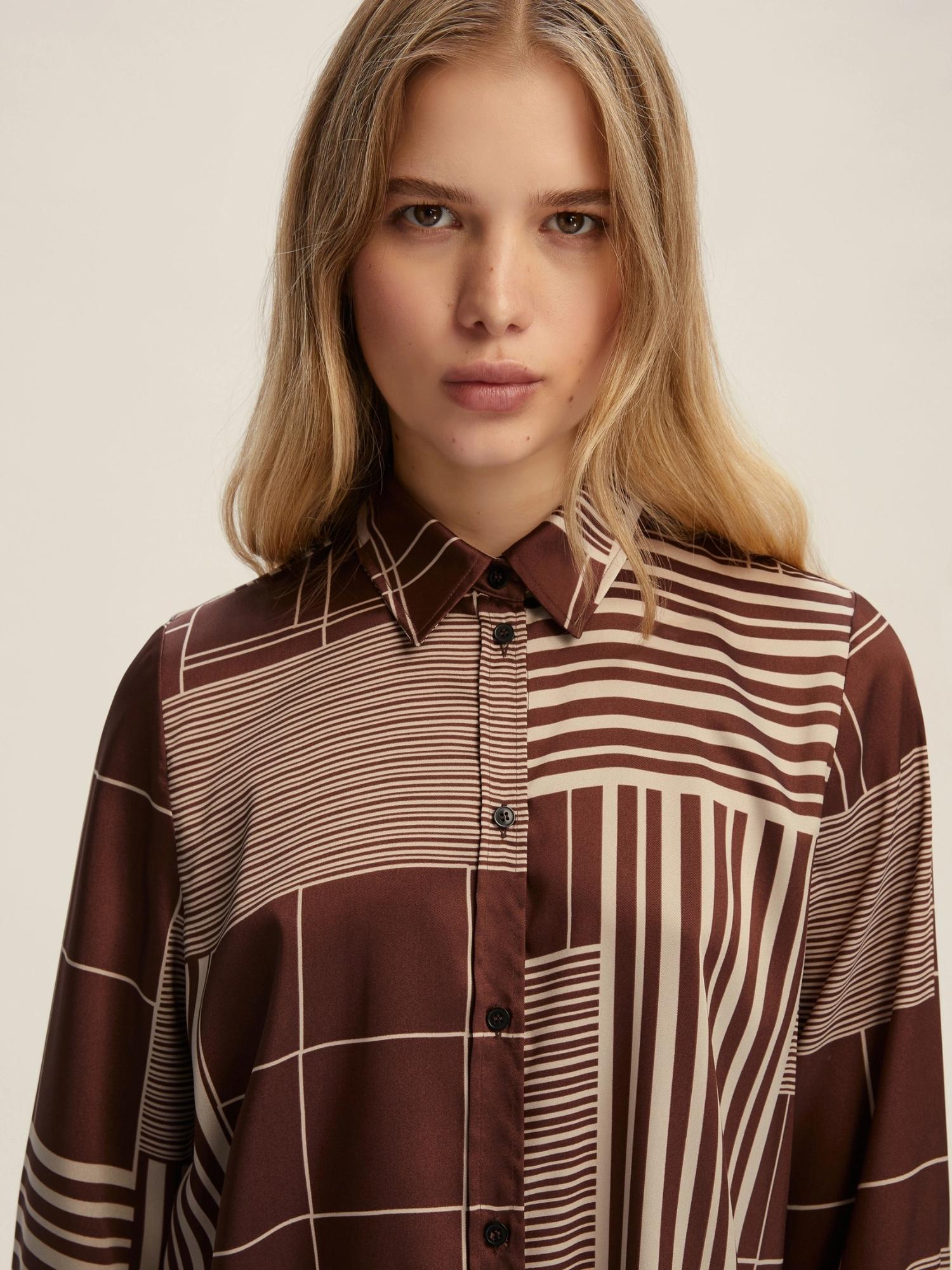 Camicia in twill stampato dal carattere grafico e disinvolto, perfetta per aggiungere un tocco contemporaneo al tuo guardaroba. Il tessuto fluido scivola sulla silhouette valorizzandola con eleganza, mentre la stampa dona freschezza e personalità. Ideale con pantaloni sartoriali e blazer tono su tono per un look raffinato, oppure con denim per uno stile easy chic. Fit dritto. Collo a camicia con abbottonatura a vista. Polso con bottone. Fondo stondato. Tessuto principale contenente oltre il 50% di poliestere riciclato. Composizione: 100% poliestere.