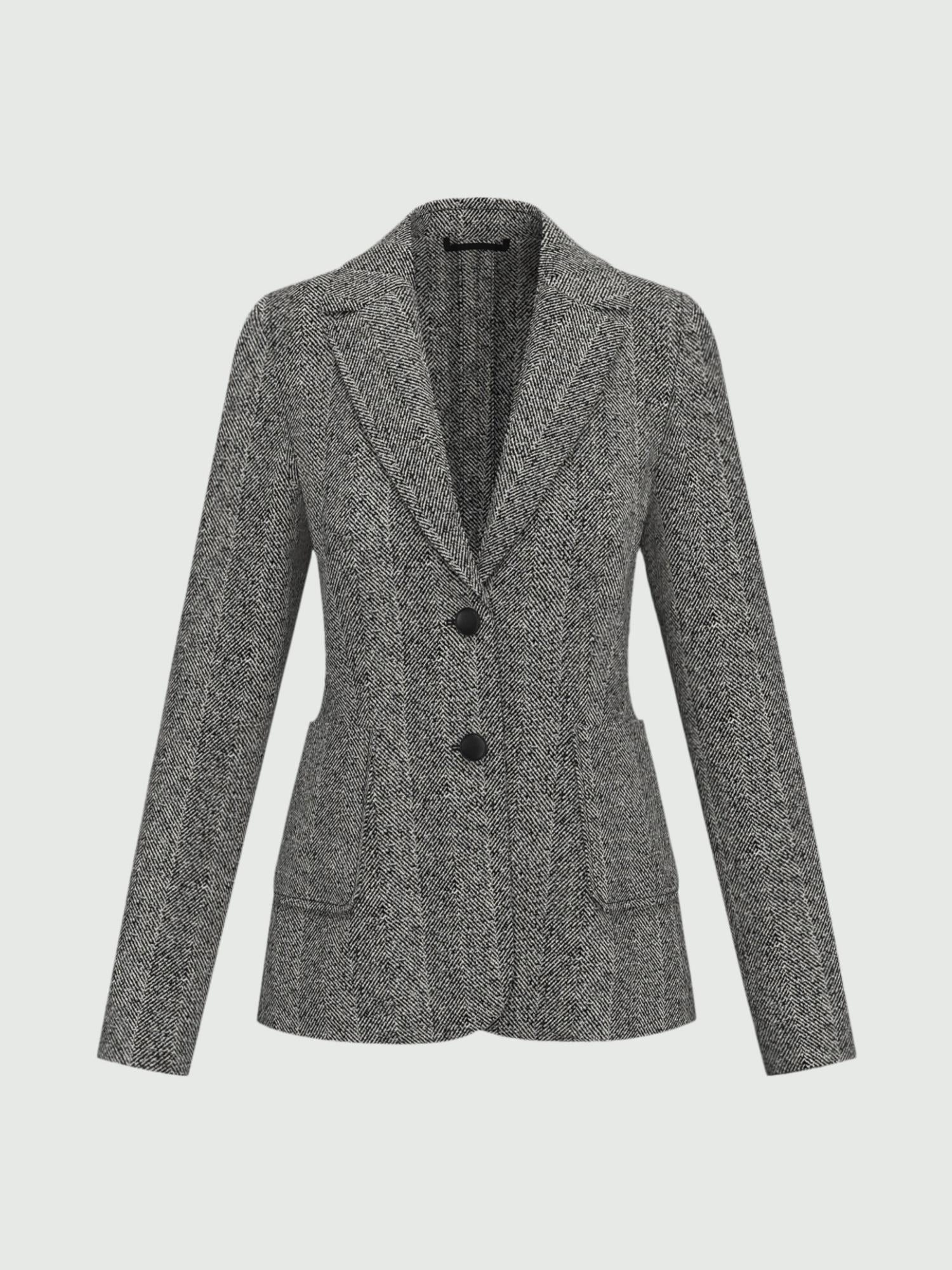 Giacca in stuoia con disegno resca in misto cotone stretch, dal fascino british e dal taglio femminile che valorizza il punto vita con eleganza. Il fit leggermente sfiancato e lo scollo con rever definiscono una silhouette raffinata, mentre le tasche applicate con impunture a vista aggiungono un tocco informale e contemporaneo. La chiusura con due bottoni a vista completa un design curato e versatile, ideale da indossare anche su un top effetto lingerie per un contrasto moderno e sensuale. Tessuto: 56% poliestere, 22% cotone, 21% viscosa, 1% elastan.
