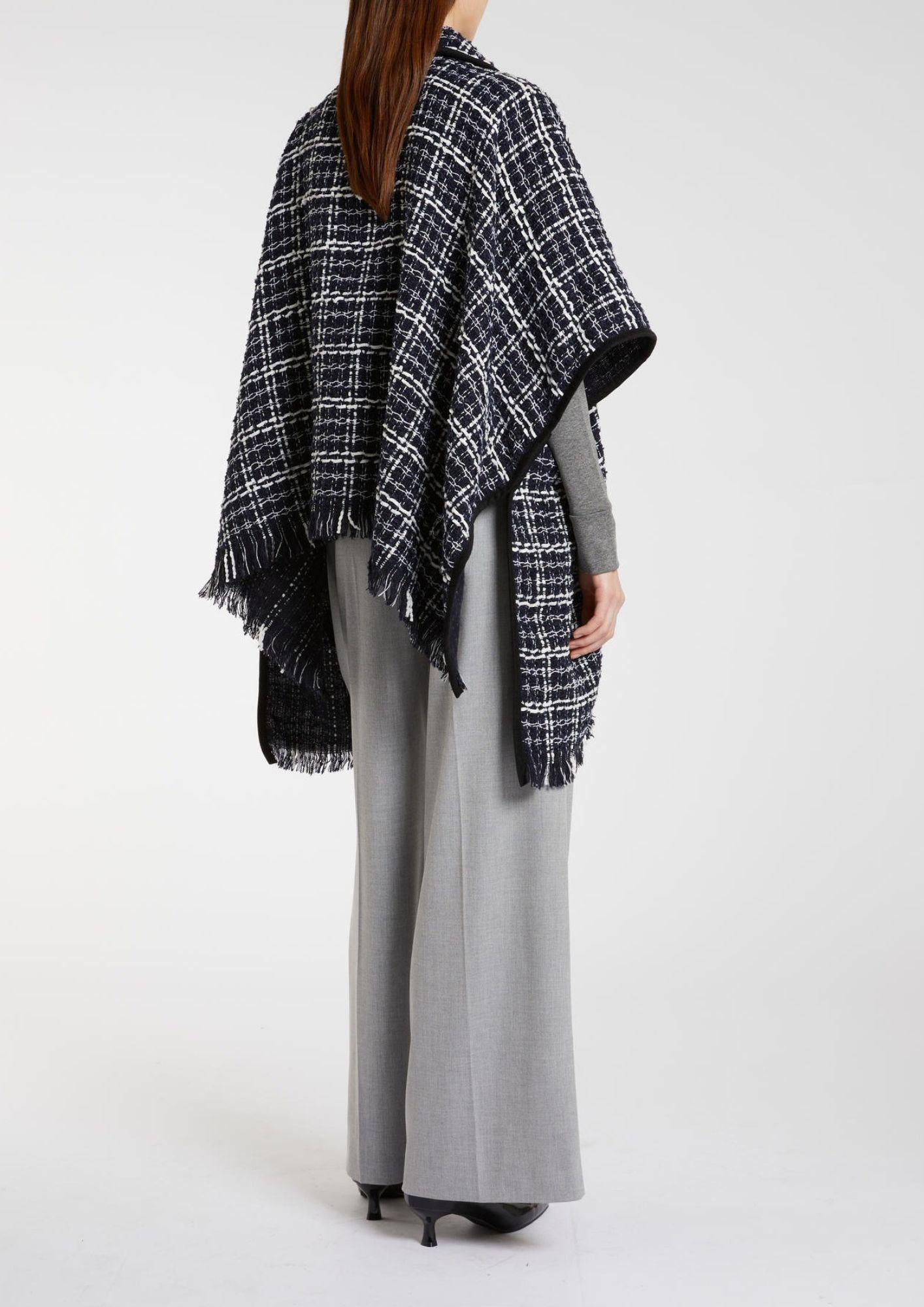 Morbido tessuto bouclé e uno scollo con piccolo rever definiscono questo nuovo poncho firmato Marella. Perfetto da indossare nelle giornate autunnali, sopra una maglia o un blazer. Poncho in tessuto tecnico bouclé, collo con rever, frange al fondo. Tessuto: 50% Poliestere, 49% Acrilica, 1% Fibra Metallizzata.