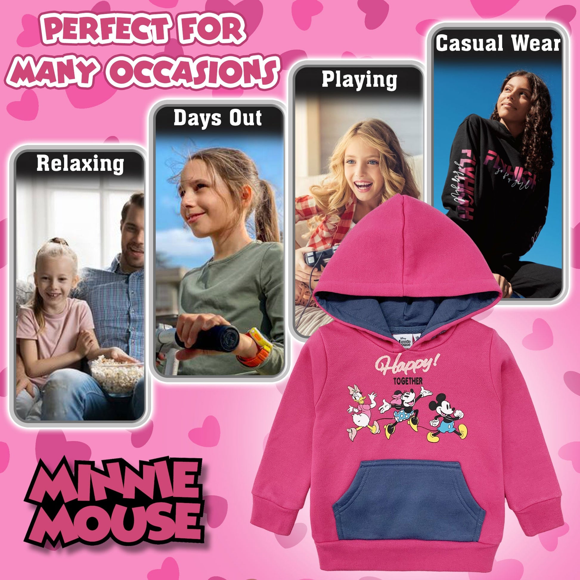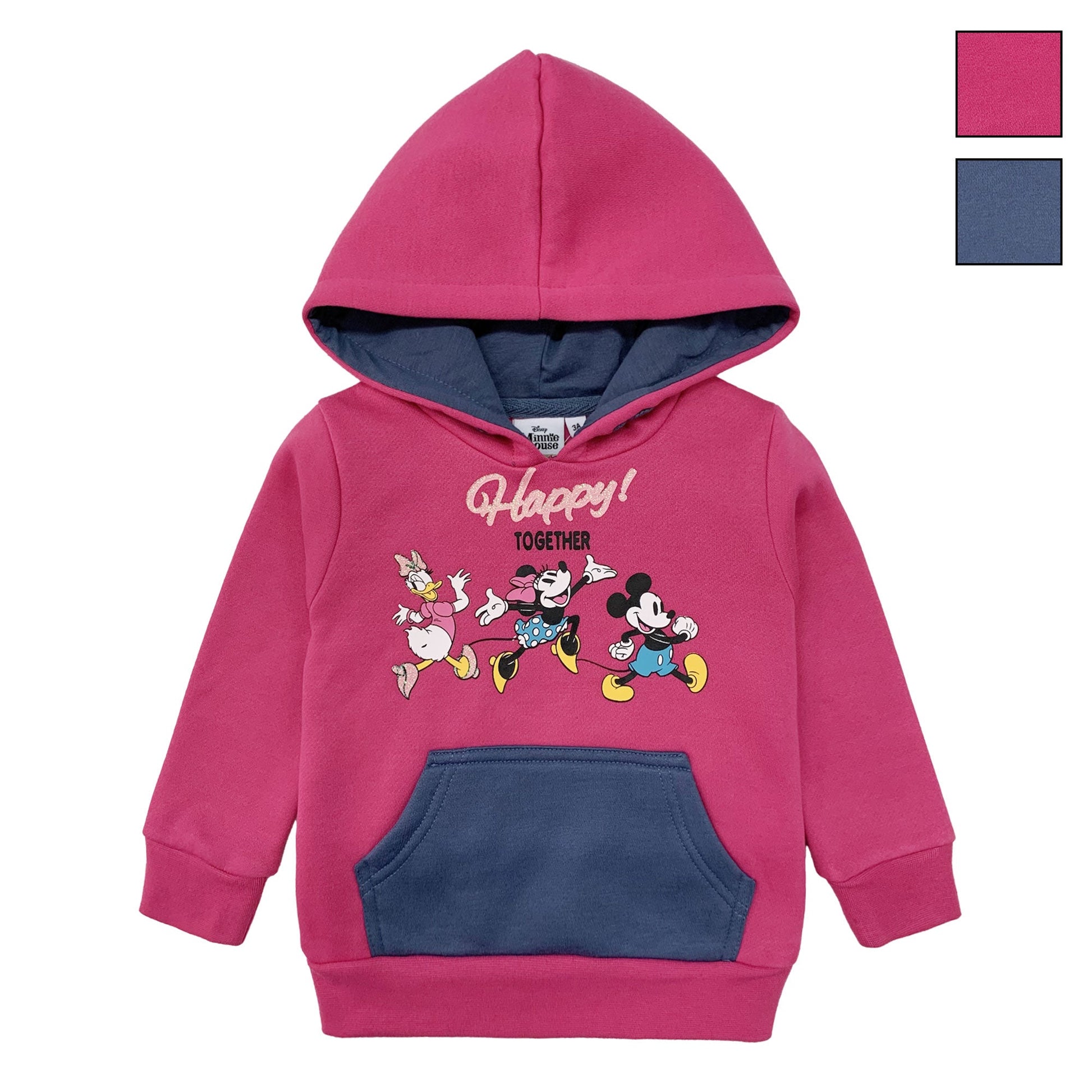 Questa adorabile felpa con cappuccio è il sogno di ogni bambina. Sul davanti, troverai una stampa magica con i celebri personaggi Disney: Paperina, Minnie e Mickey Mouse, tutti insieme a esclamare "Happy! together" in lettere scintillanti. È un'esplosione di gioia e allegria che la tua bambina adorerà indossare.