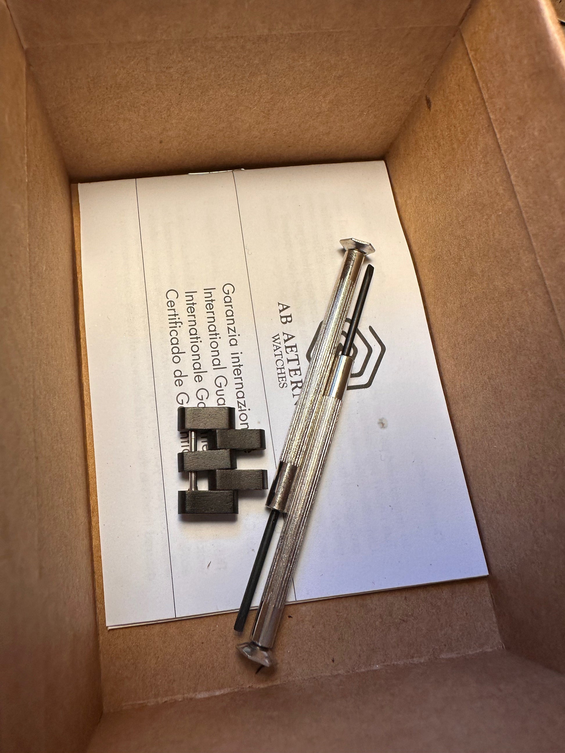 Completo di maglie per allungare il bracciale e cacciavite dedicato.
