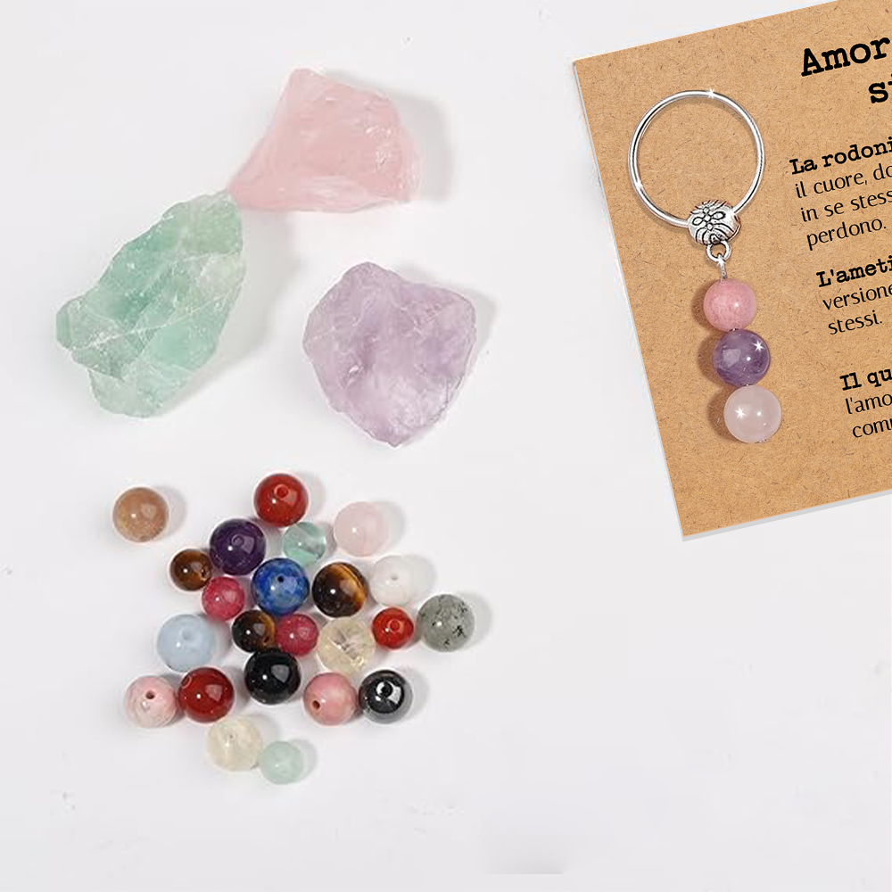 - Ogni portachiavi include un piccolo cartoncino con il significato del cristallo scelto