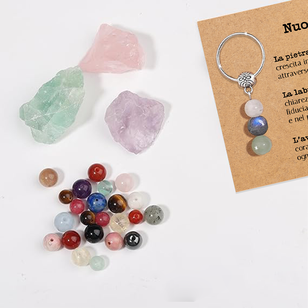 - Ogni portachiavi include un piccolo cartoncino con il significato del cristallo scelto