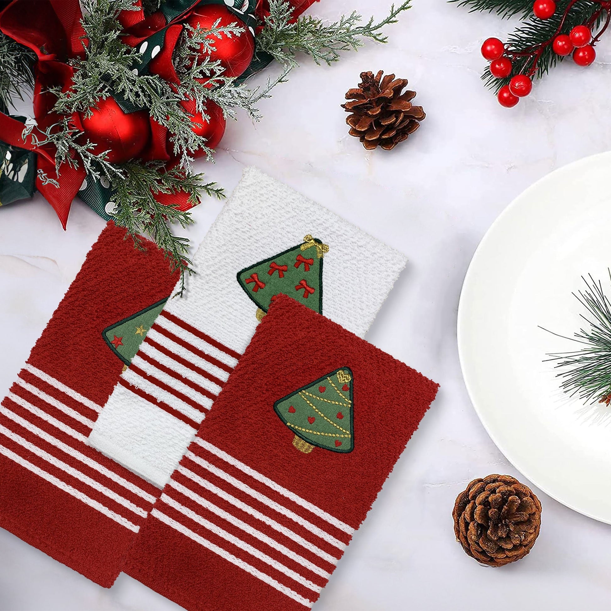 Il set è composto da tre strofinacci, due canovacci sono in rosso con righe bianche, decorati con incantevoli alberelli con stelline e cuoricini ricamati, pronti a portare un sorriso di gioia a ogni tuo gesto in cucina. Il terzo canovaccio, in un elegante color bianco e righe rosse, sfoggia un albero di Natale con fiocchi splendidamente ricamato, che trasmette l'atmosfera festiva in ogni angolo della tua cucina.