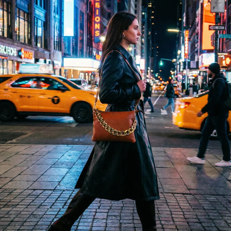 This shoulder bag is made from eco leather and features a gold-tone chain handle for added detail. An adjustable strap allows for different carrying options. The bag includes multiple interior and exterior pockets to help organize everyday items. Designed for daily use, it offers practical storage in a clean, contemporary style.