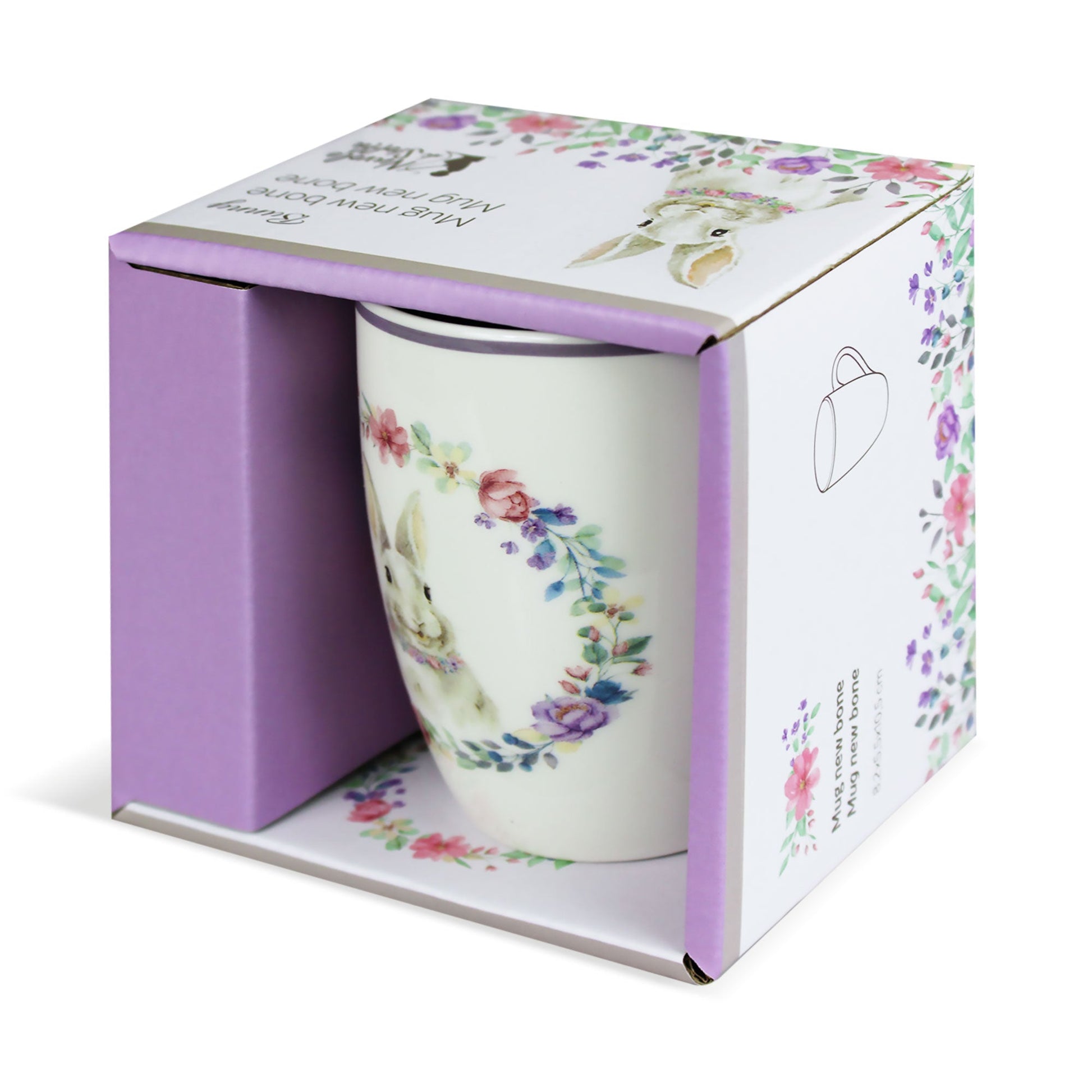 La sua forma delicatamente sagomata, impreziosita da un manico ergonomico, offre un tocco di raffinatezza senza pari. Al centro della tazza, un raffinato motivo floreale incornicia con grazia un tenero coniglietto, creando un quadro pasquale incantevole e accattivante.