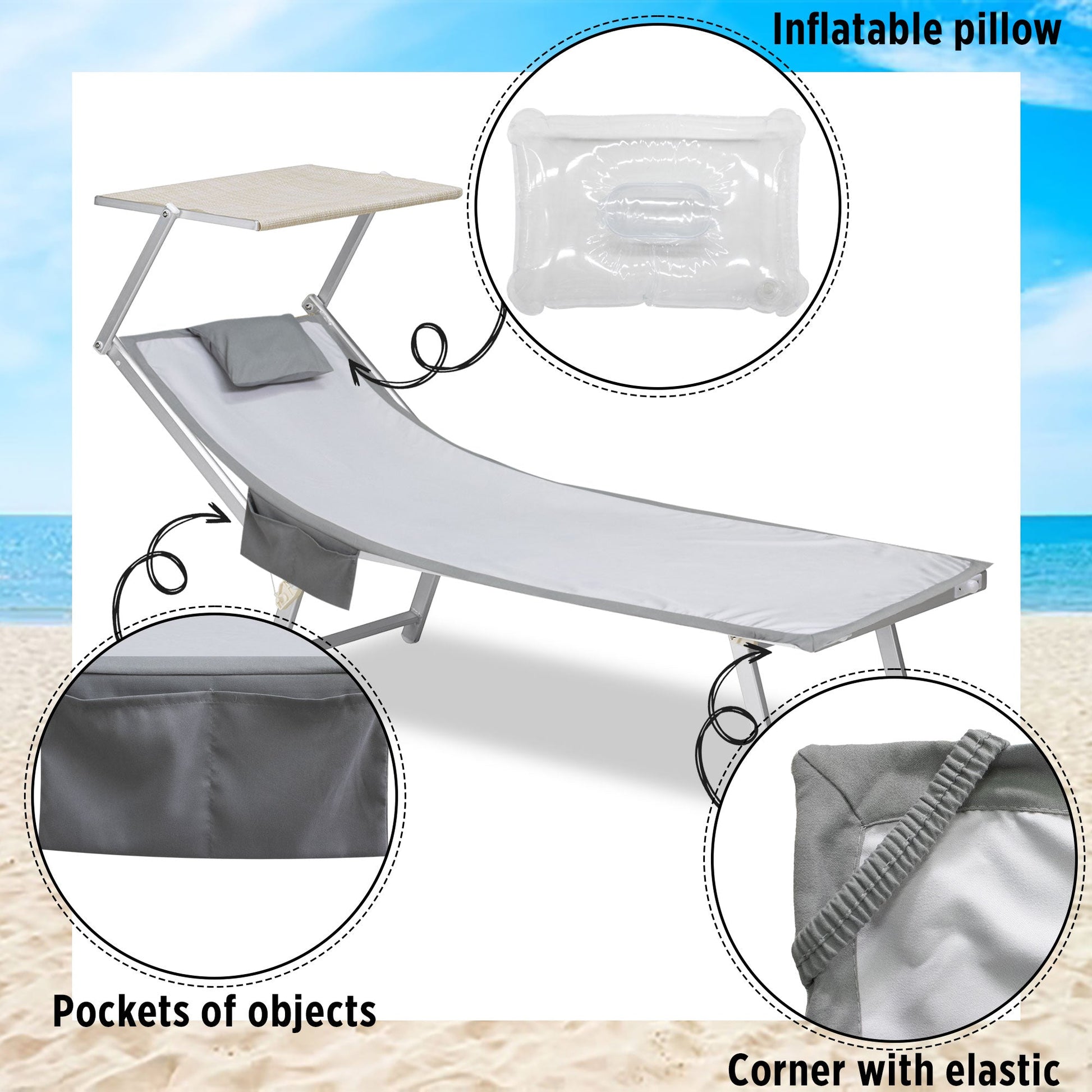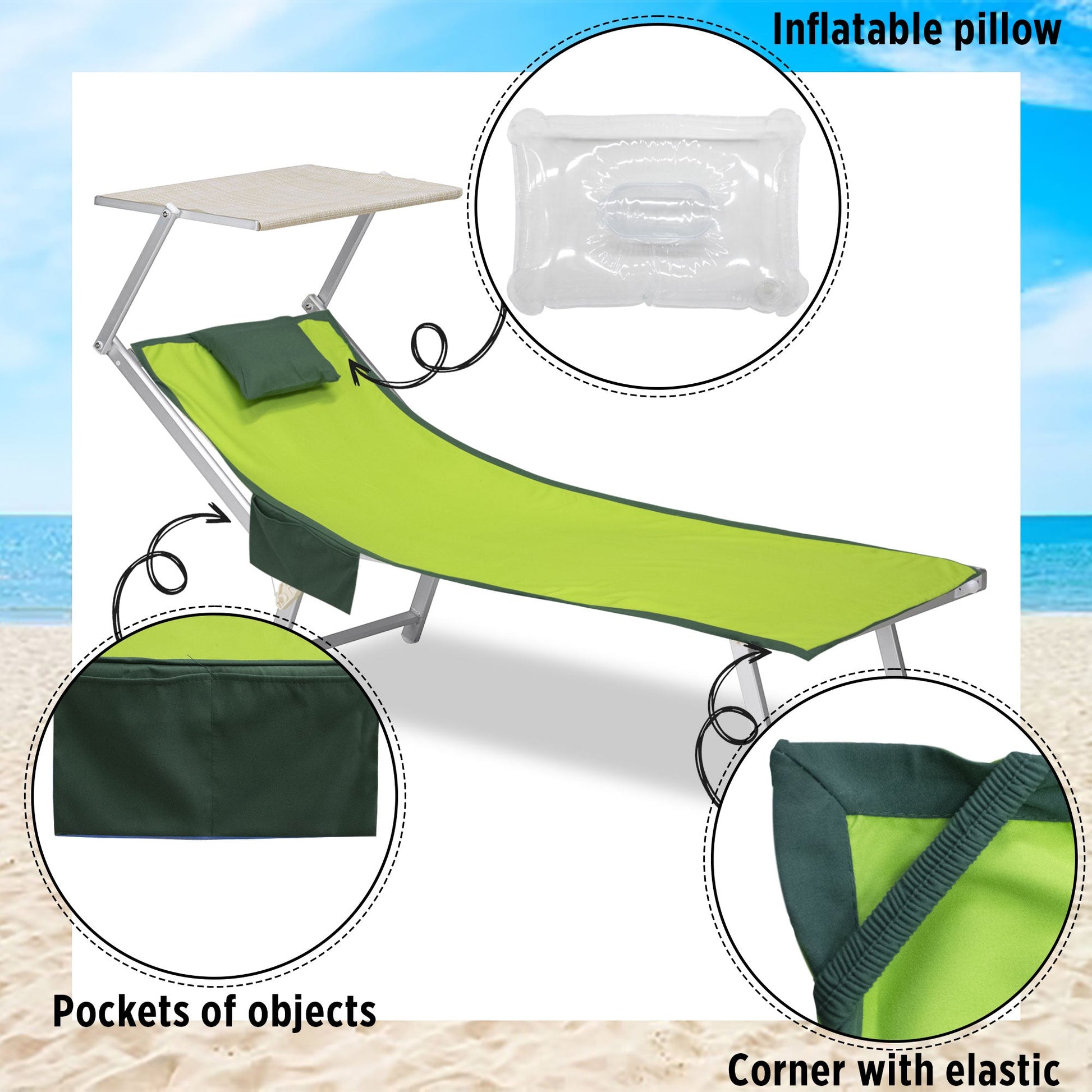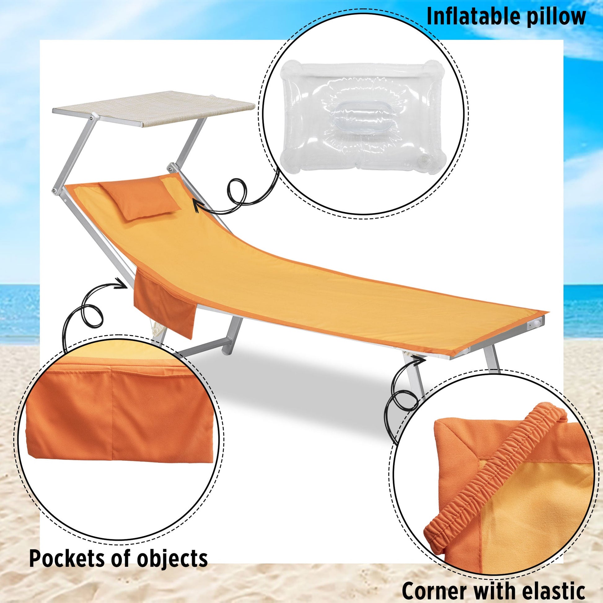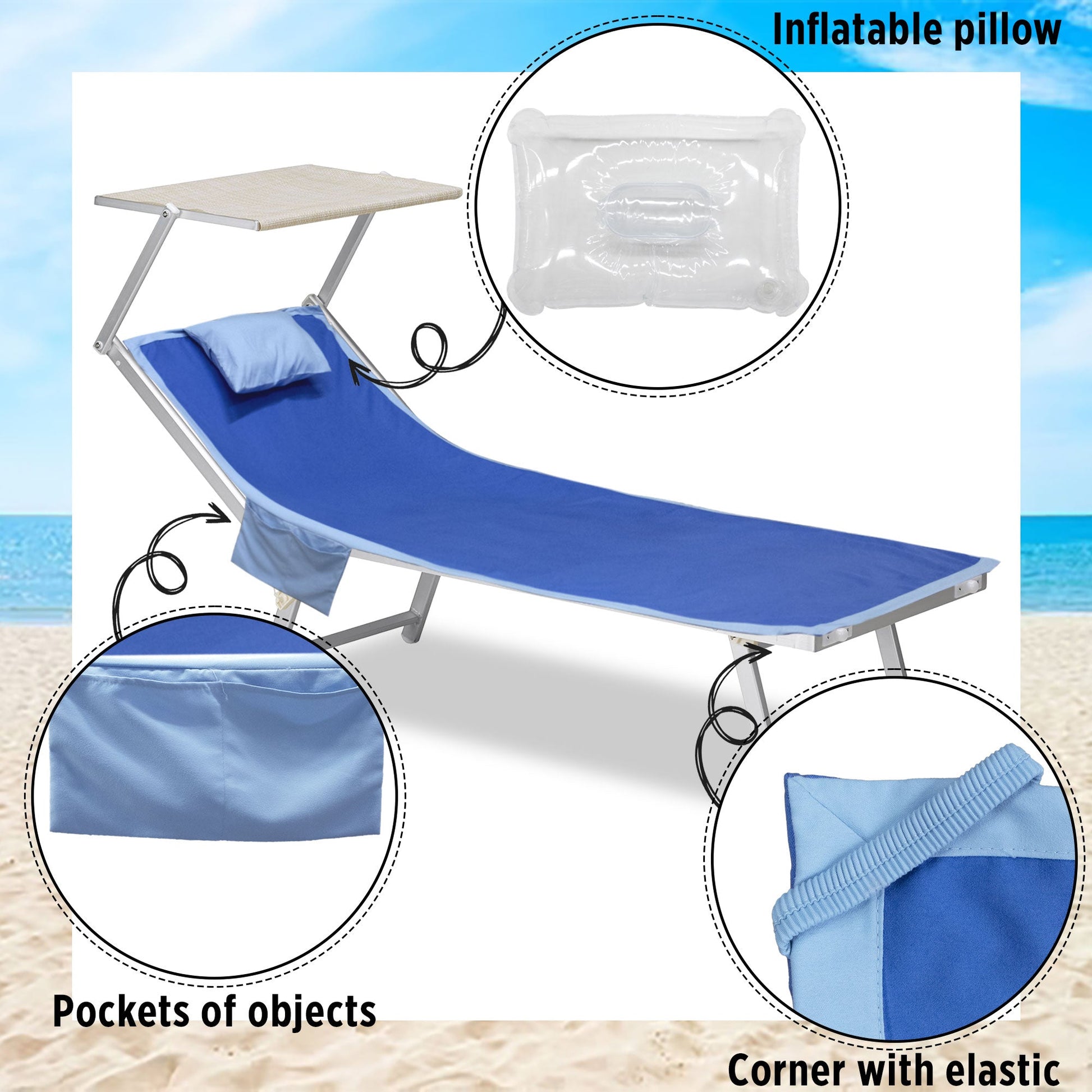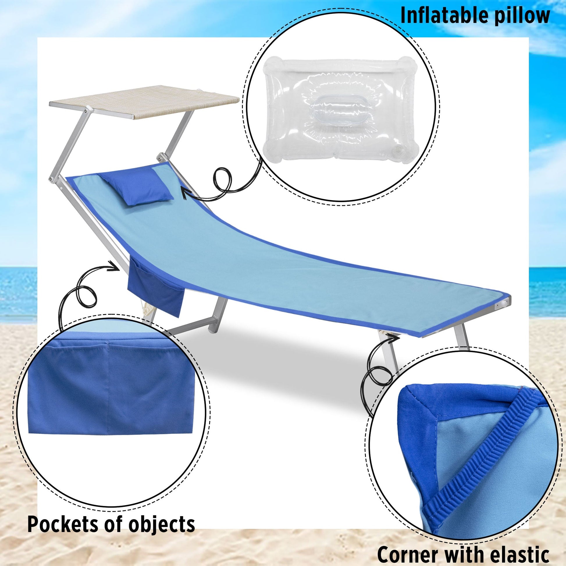 Una delle sue qualità più apprezzate è la sua praticità. Grazie ai 4 elastici negli angoli, il telo resta saldamente fissato al lettino senza scivolare, offrendoti così una sensazione di stabilità e comfort. Le 2 tasche laterali ti consentono di tenere a portata di mano gli oggetti essenziali come le chiavi o il cellulare, mentre la tasca superiore è progettata appositamente per ospitare il cuscino relax gonfiabile incluso nella confezione, per un completo relax in spiaggia.