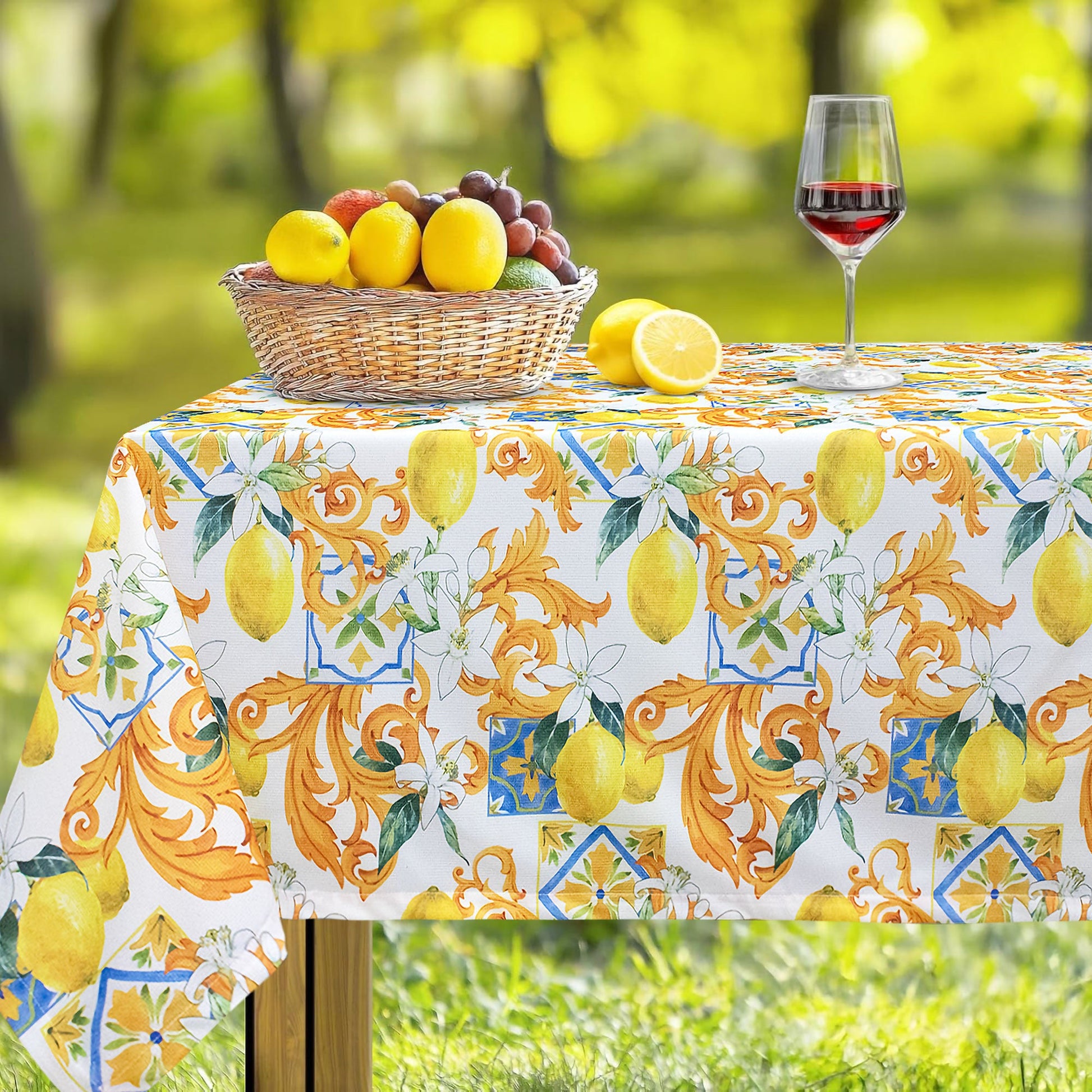Aggiungi un tocco di eleganza alla tua tavola con la nostra tovaglia antimacchia dalla raffinata fantasia vietrese con limoni. Su uno sfondo vietrese, spiccano limoni stampati, creando un effetto visivo estivo e armonioso. Perfetta per donare stile e classe a ogni occasione, che sia una cena informale o una ricorrenza speciale.