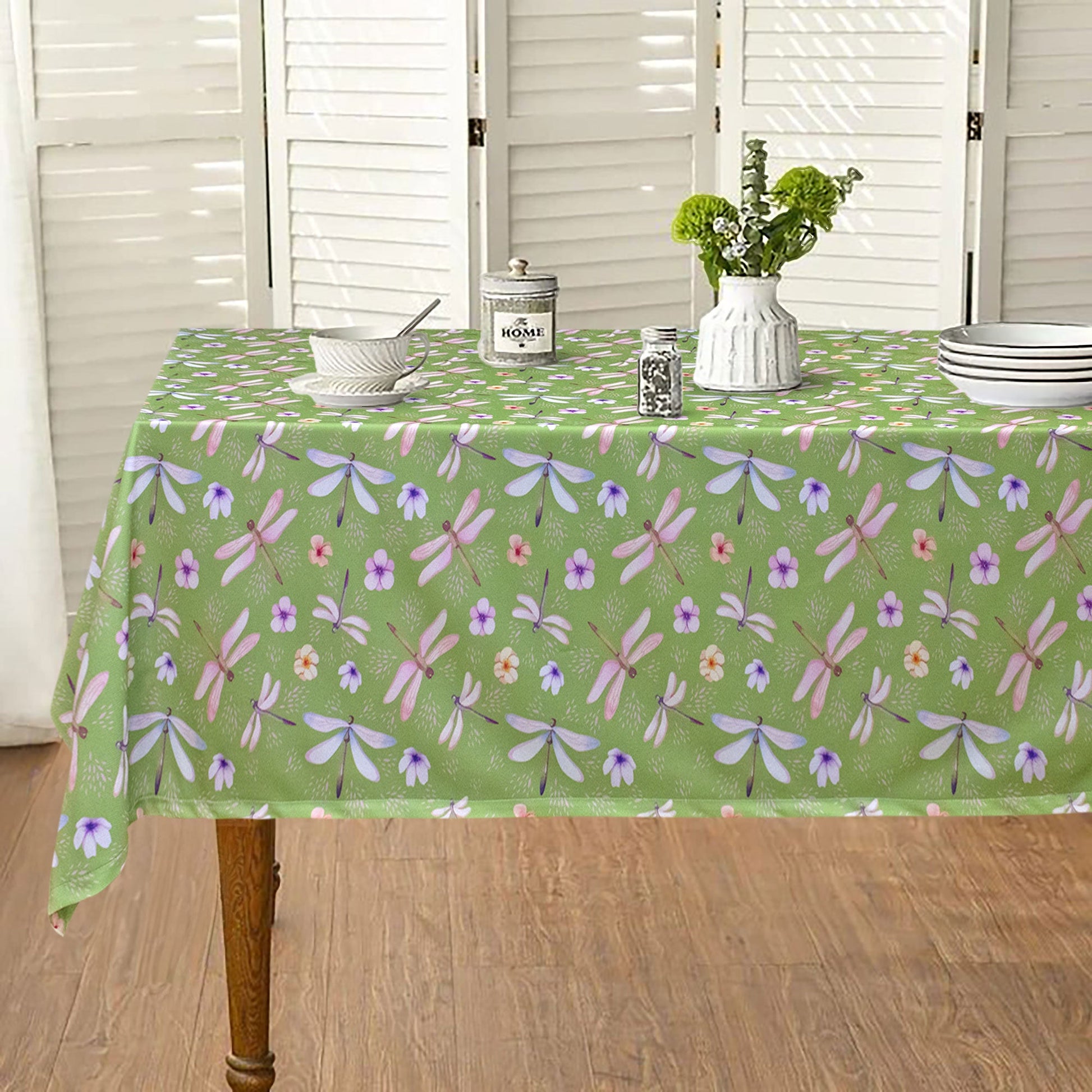 Aggiungi un tocco di freschezza e stile alla tua tavola con la nostra tovaglia antimacchia 18 posti, perfetta per ogni occasione. La tovaglia presenta una delicata stampa di libellule e fiorellini su uno sfondo verde, creando un'atmosfera naturale e rilassante.