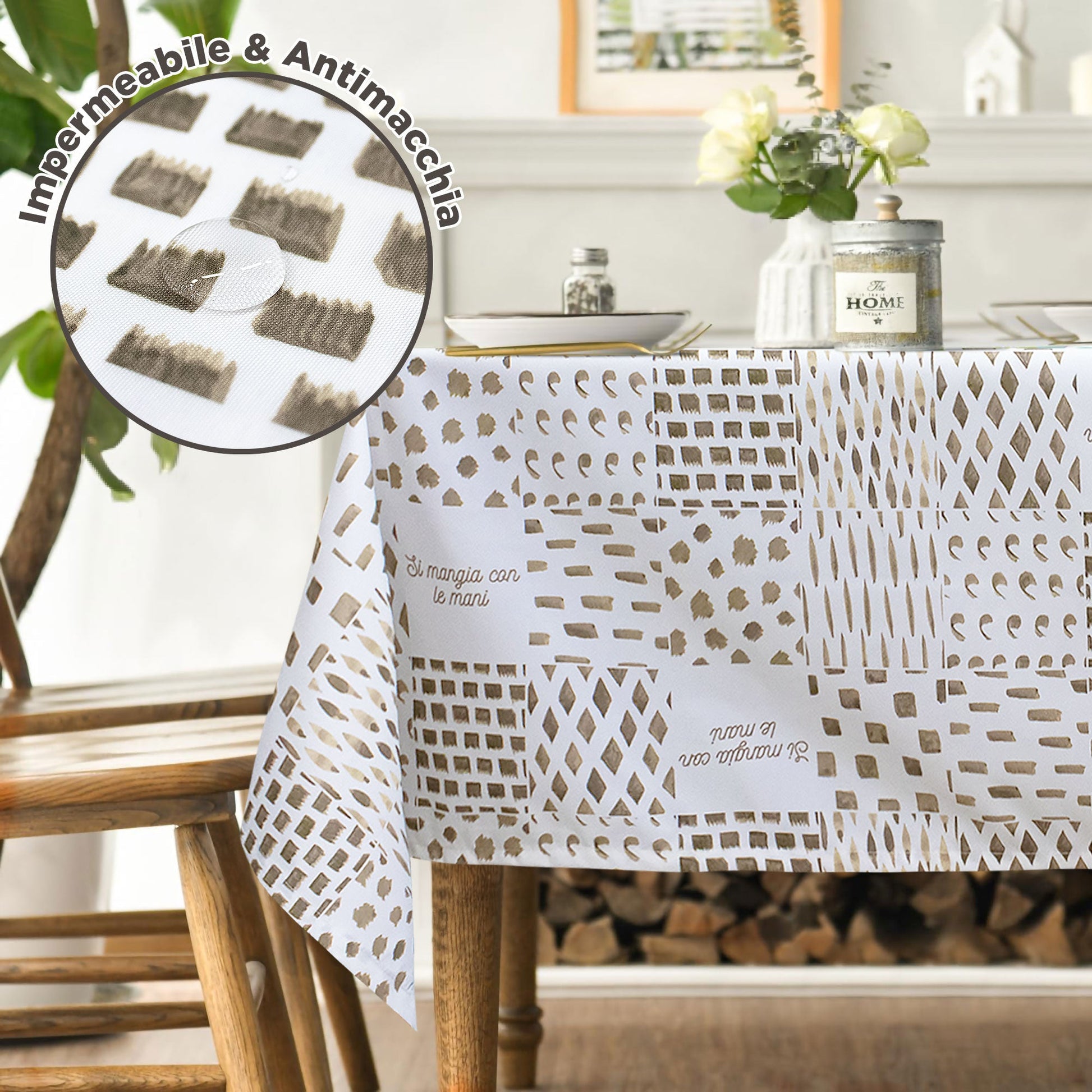 Aggiungi stile e praticità alla tua tavola con la nostra tovaglia antimacchia per 6 posti. Il design geometrico presenta una composizione armoniosa di quadrati, rettangoli e linee diagonali, creando un effetto moderno ed elegante. Alcuni riquadri riportano la frase "Si mangia con le mani", aggiungendo un tocco di originalità e ironia al tuo ambiente.