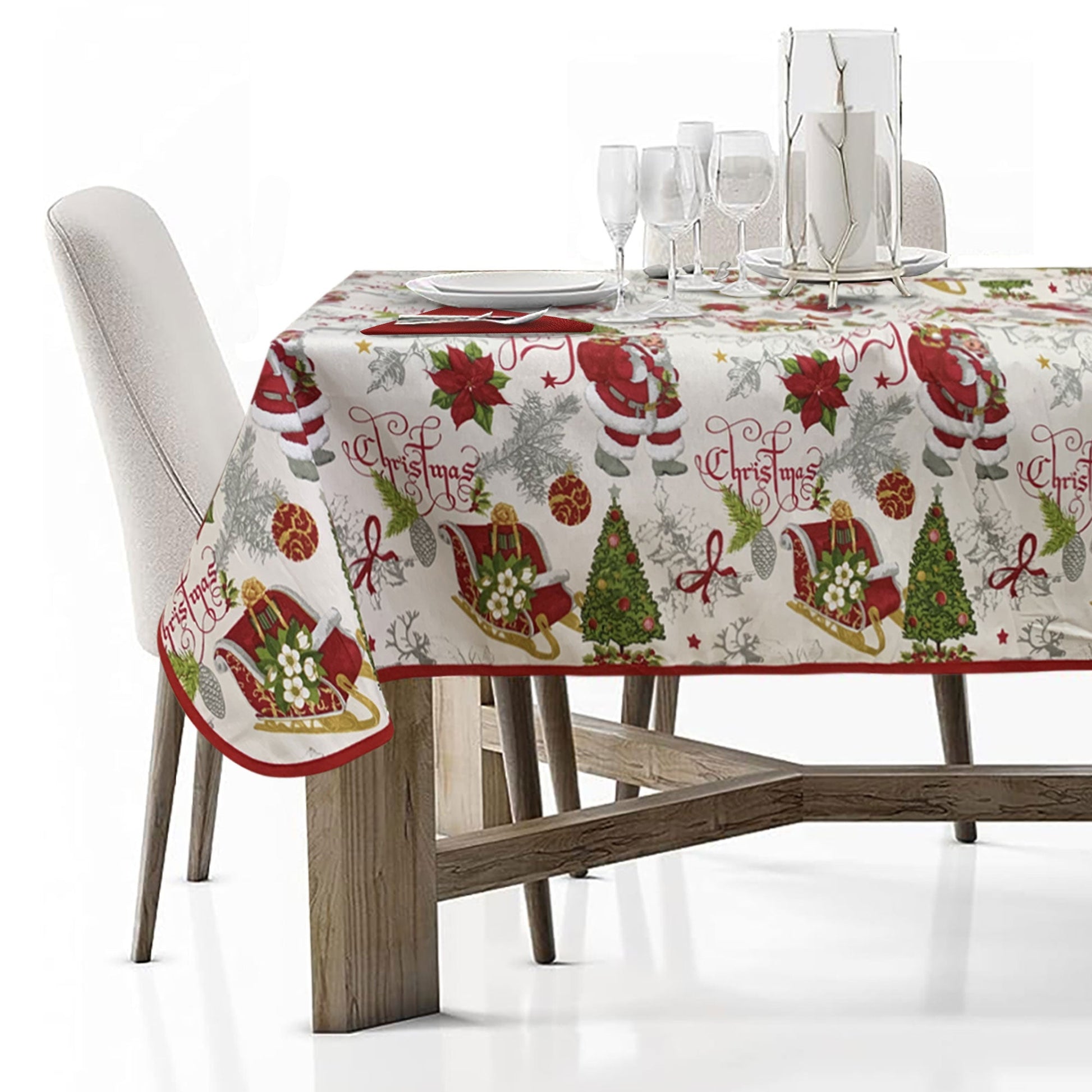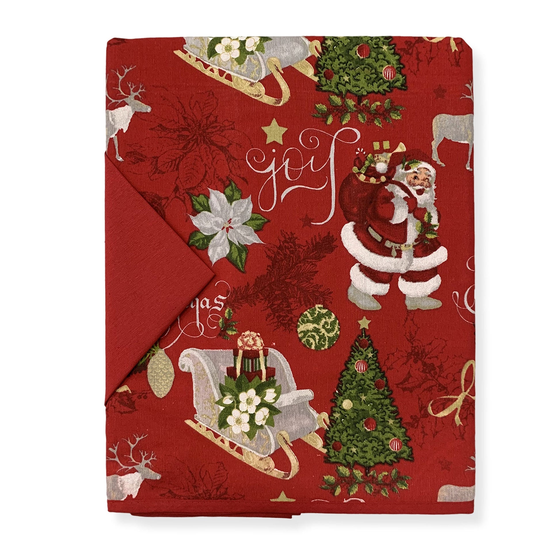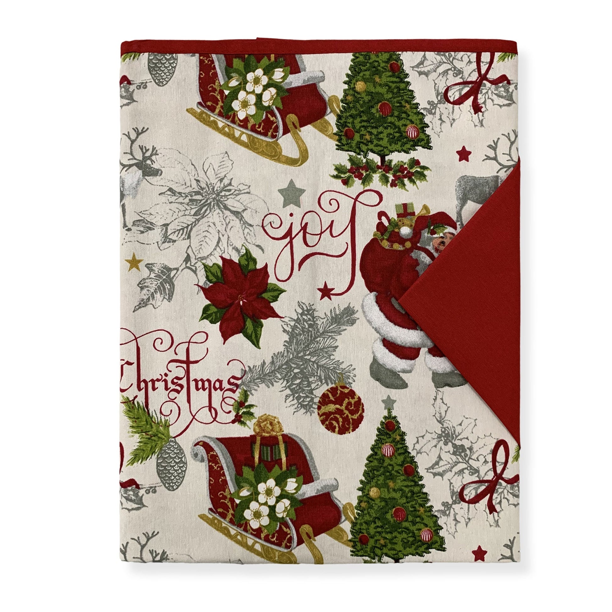La tovaglia da 140x355cm è realizzata in resistente cotone loneta, con una trama di 180gr/mq che la rende perfetta per l'uso quotidiano. La stampa con motivi natalizi aggiunge un tocco di festa all'ambiente, mentre il bordo rifinito con sbieco in tinta unita completa il look con stile.