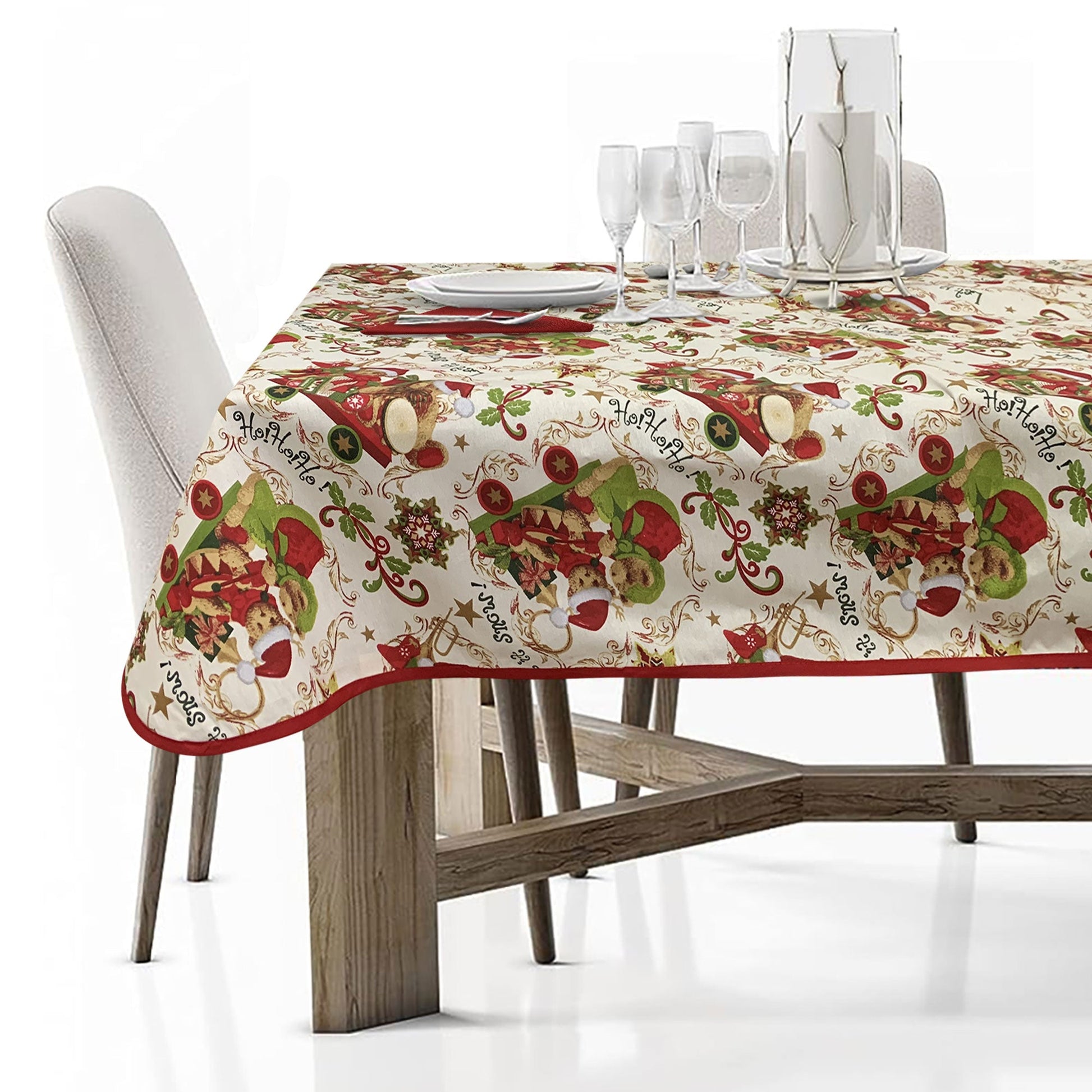 La tovaglia da 140x445cm è realizzata in resistente cotone loneta, con una trama di 180gr/mq che la rende perfetta per l'uso quotidiano. La stampa con motivi natalizi aggiunge un tocco di festa all'ambiente, mentre il bordo rifinito con sbieco in tinta unita completa il look con stile.