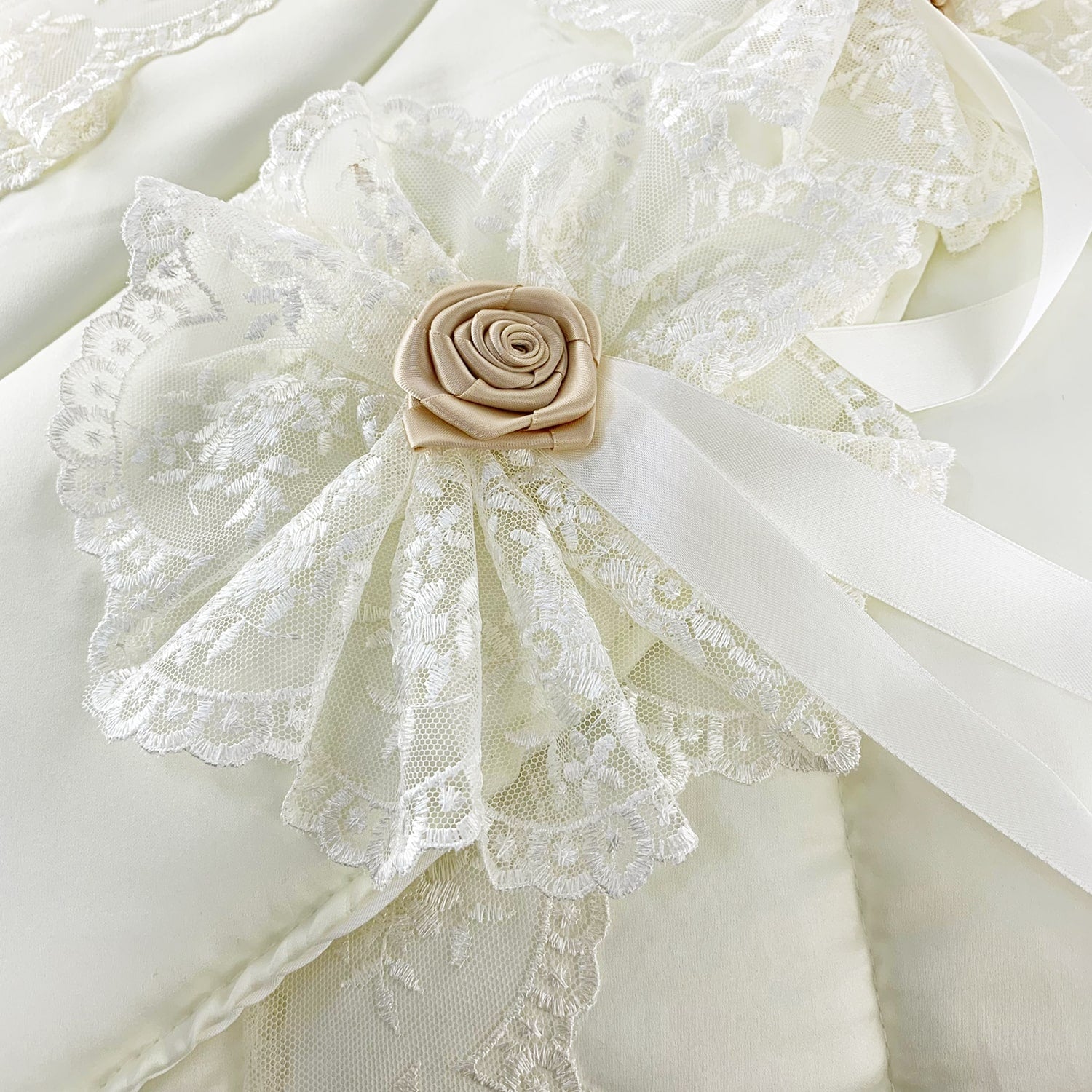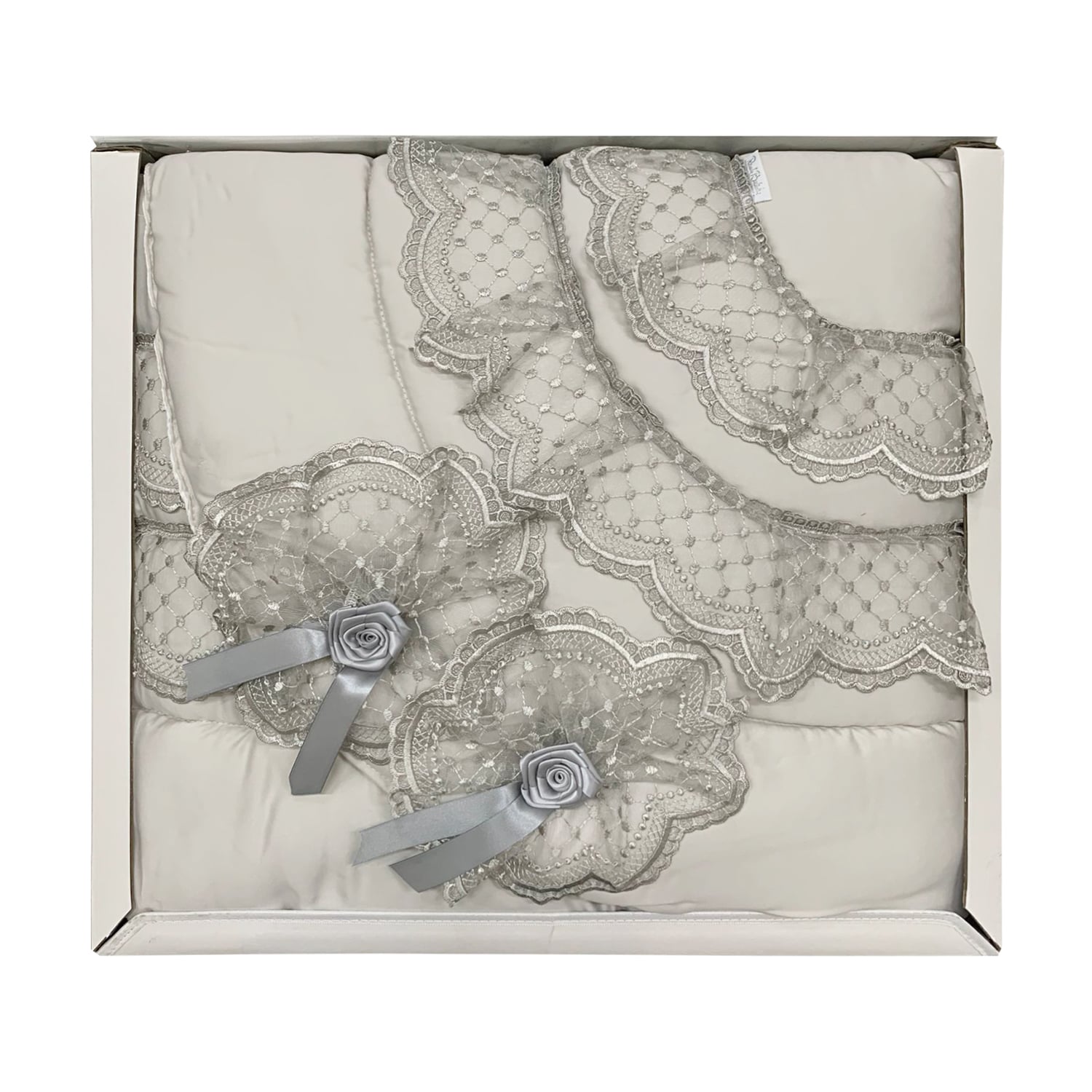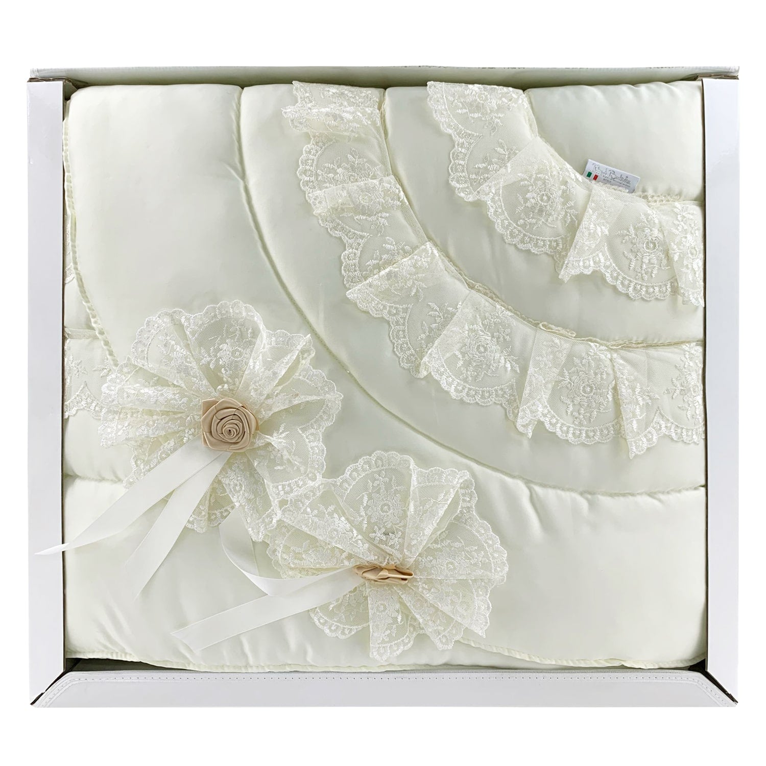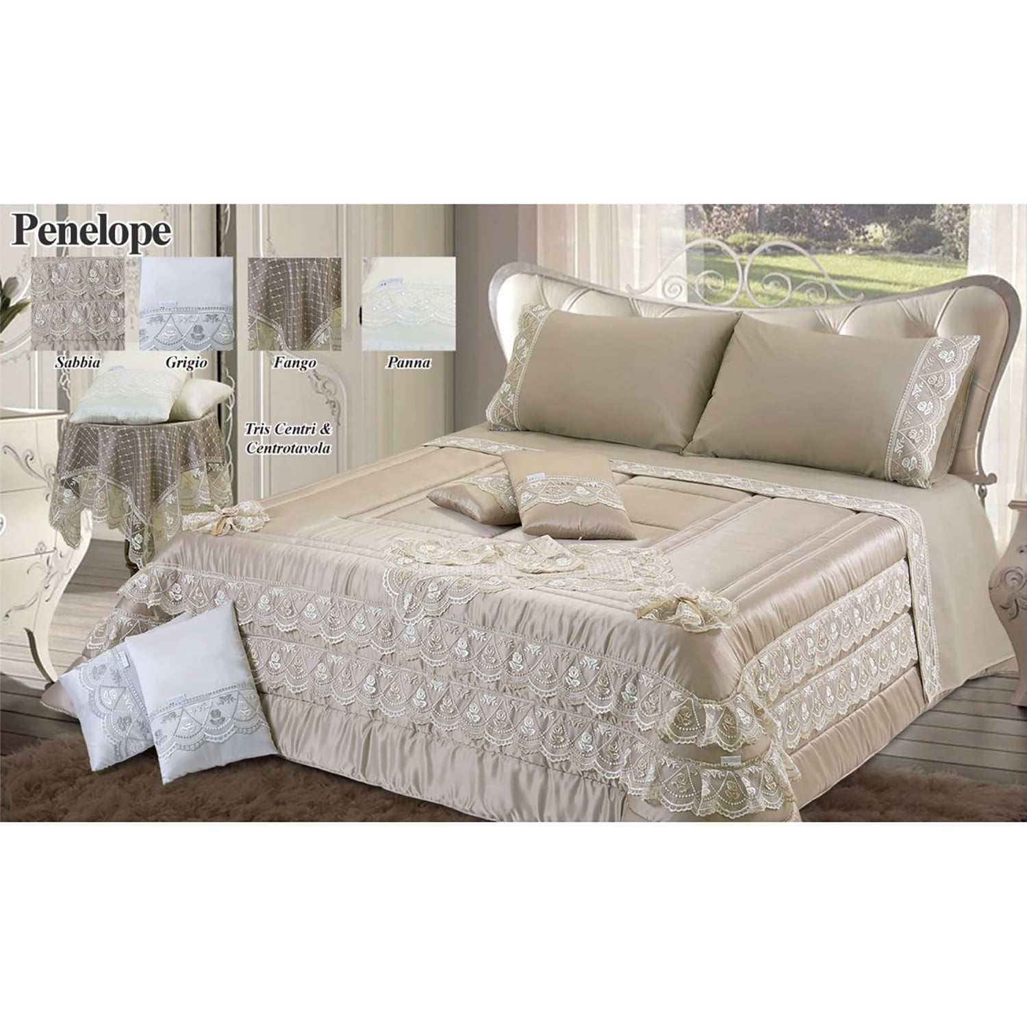La trapunta Art. Penelope con il suo tessuto, applicazioni in merletto e fiocchetti in raso si adatta a un ambiente elegante.