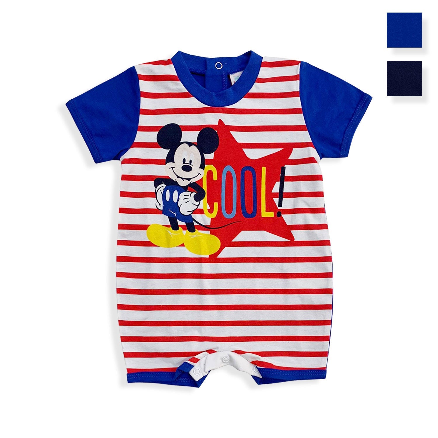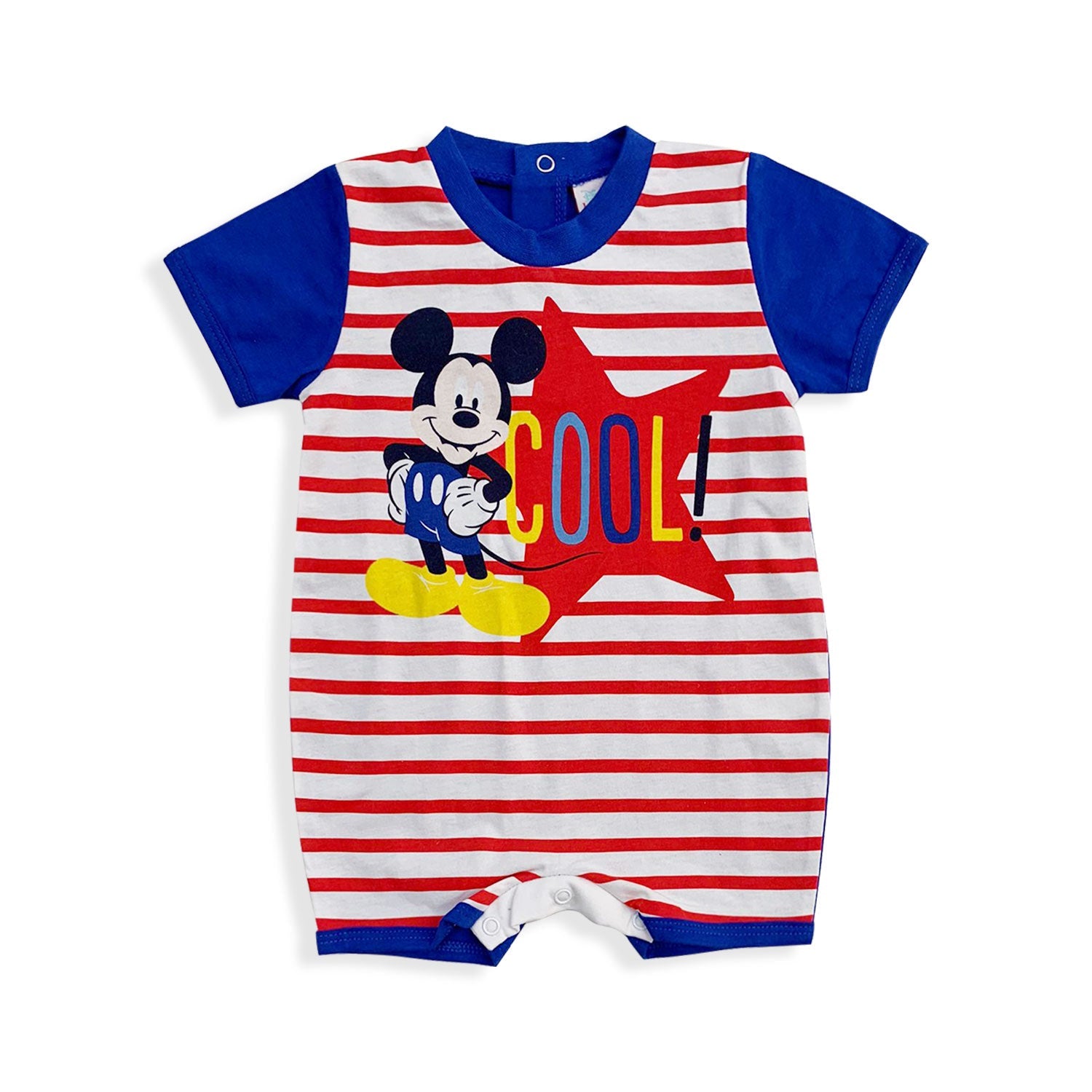 Tutina in cotone leggero con stampa sul davanti di Mickey Mouse Cool. Bottoncini clip sul dietro e fondo per un cambio facile del pannolino.