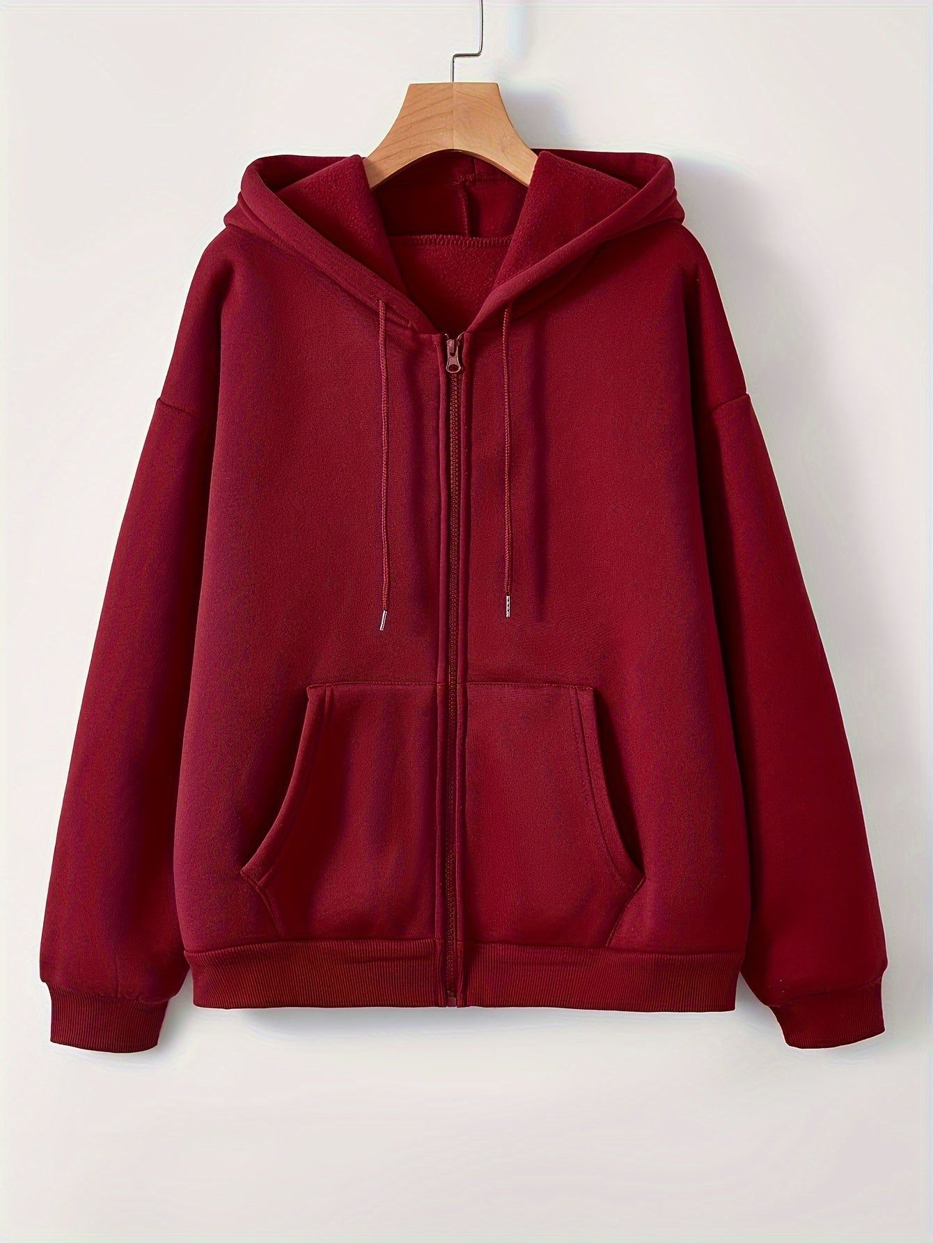 Women's Basic Solid Color Zip-Up Hoodie With Drawstrings, Comfortable Plush Lined Warm Hooded Sweatshirt For Fall & Winter
